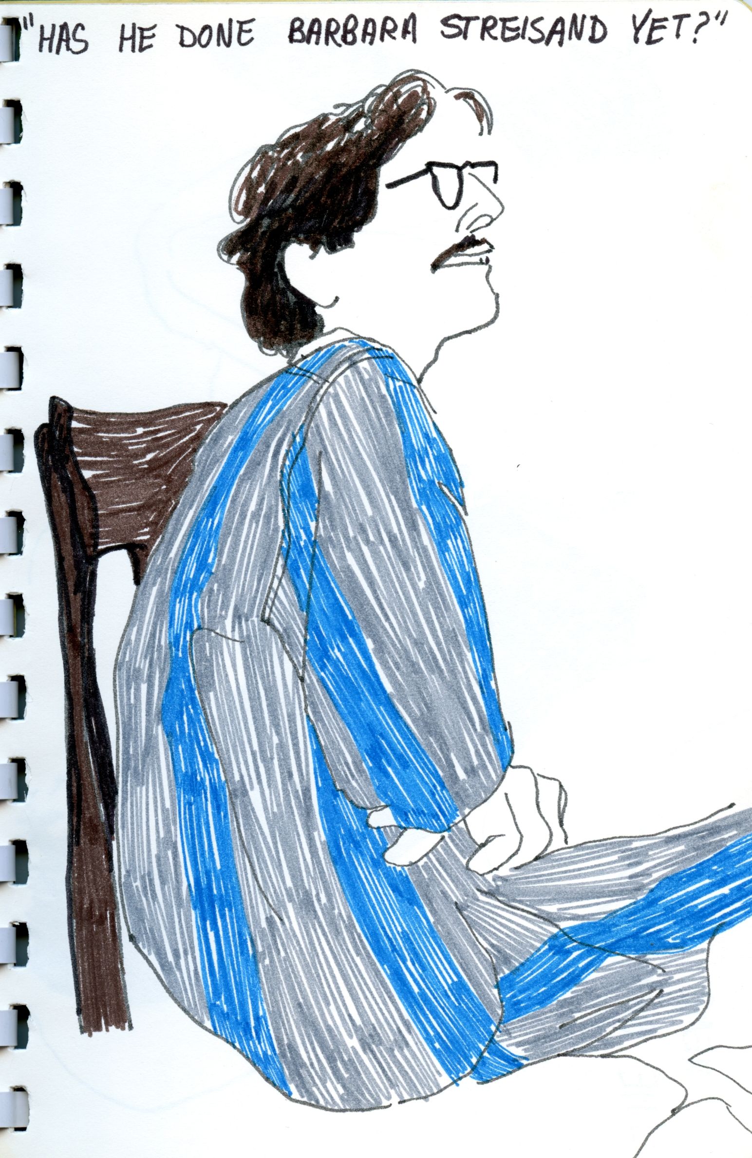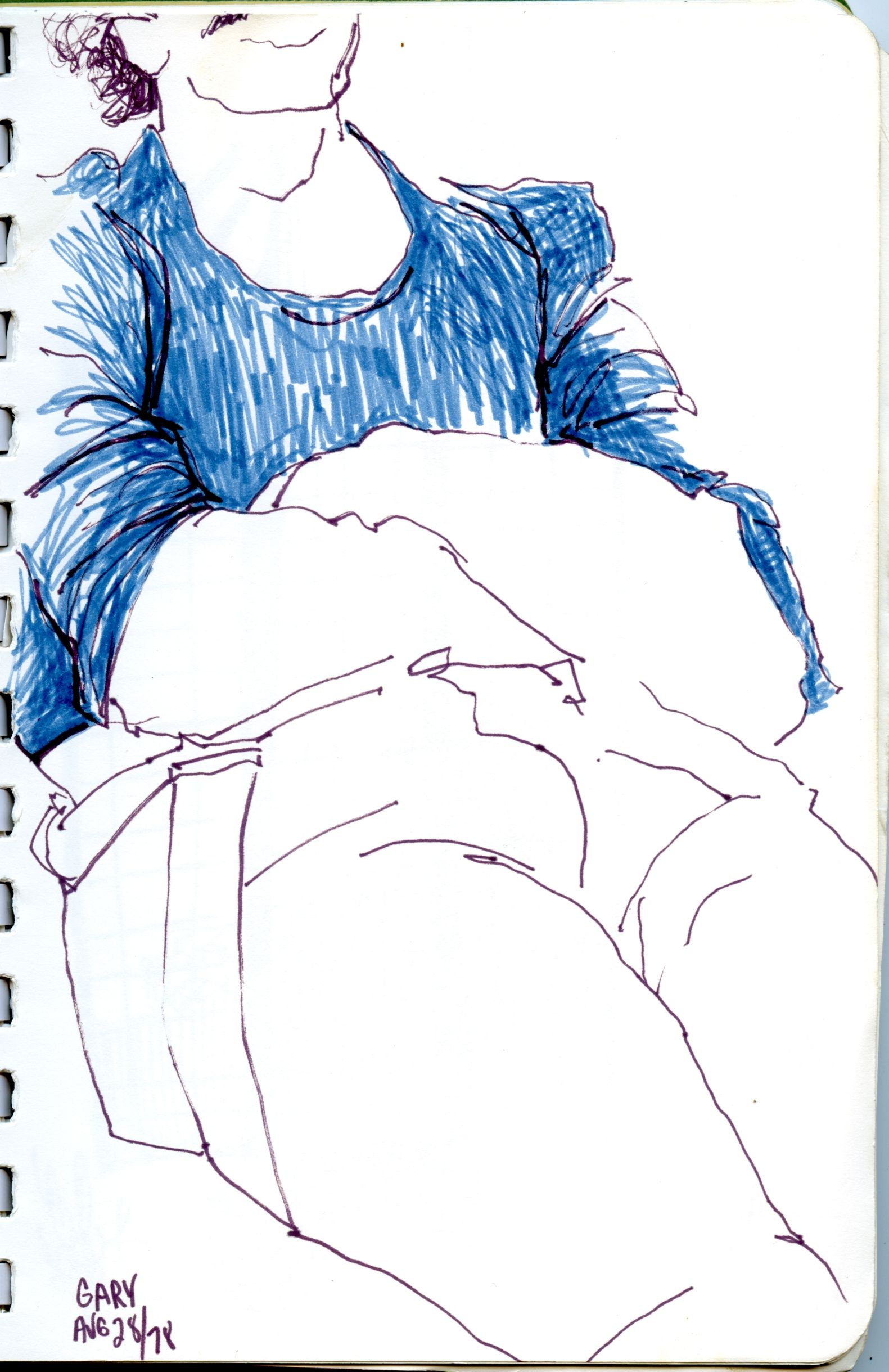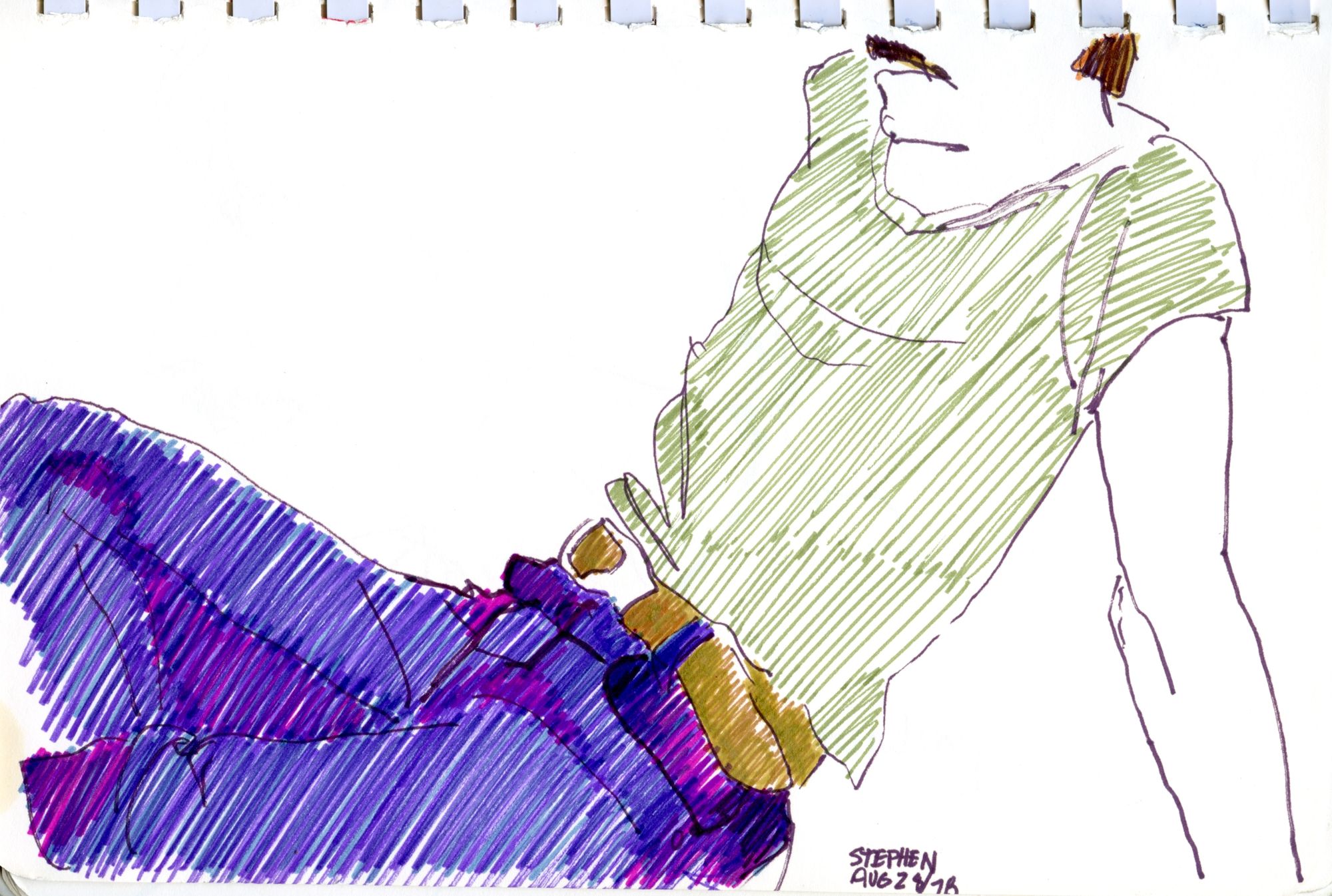 I've always found drawing faces to be a challenge and often wound up cutting them off, but the poses that remain are eerily familiar, even after all these years. For instance, Stephen never just sat in a chair, he'd pretzel himself into this or that position, or abandon the chair entirely and sprawl on the floor. The clothes and bits of furniture also bring back memories from that time. [BTW, Gary was never fat. Artistic perspective].