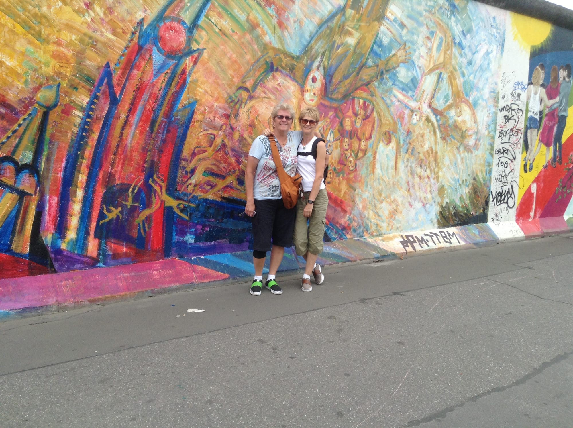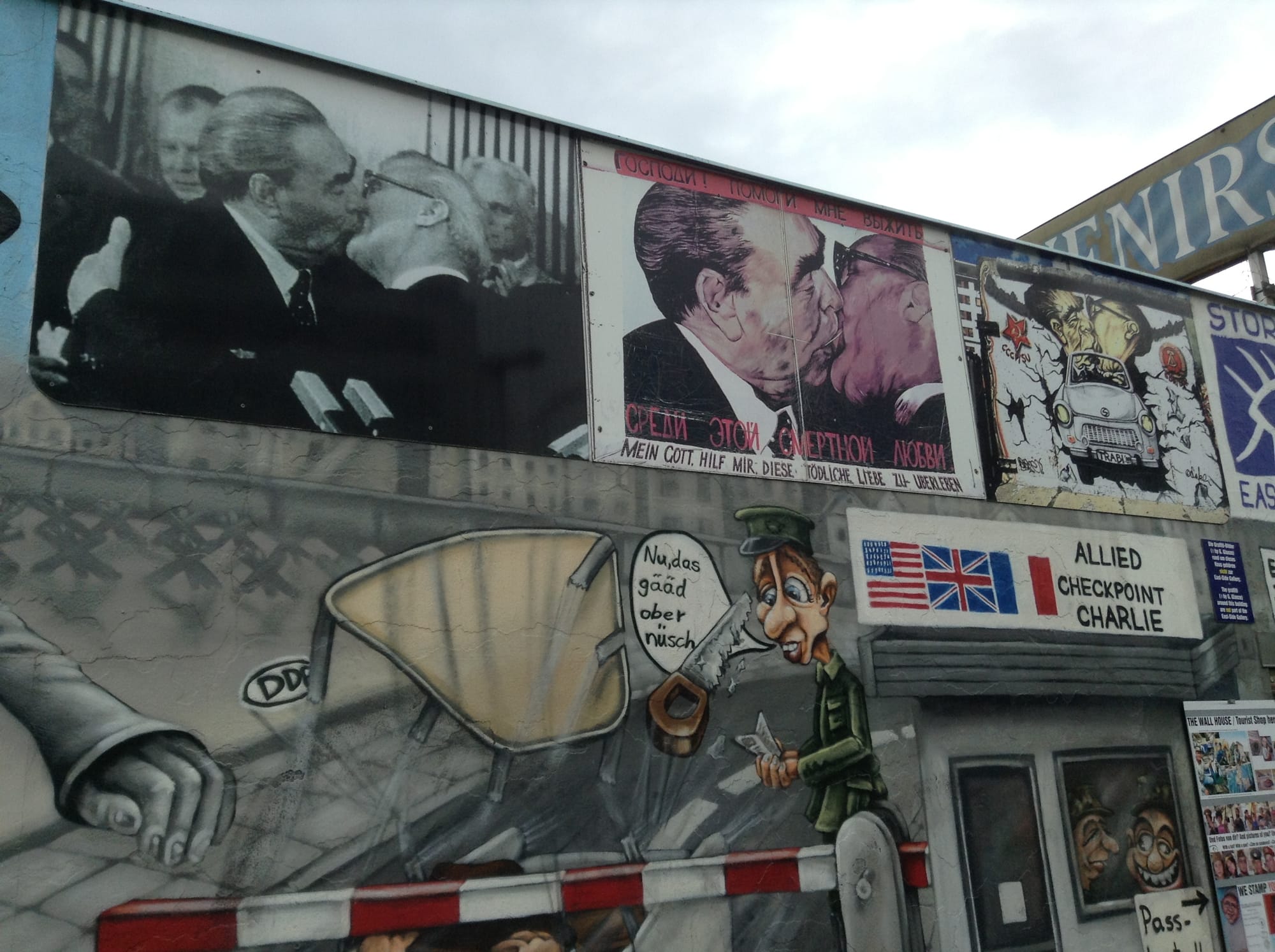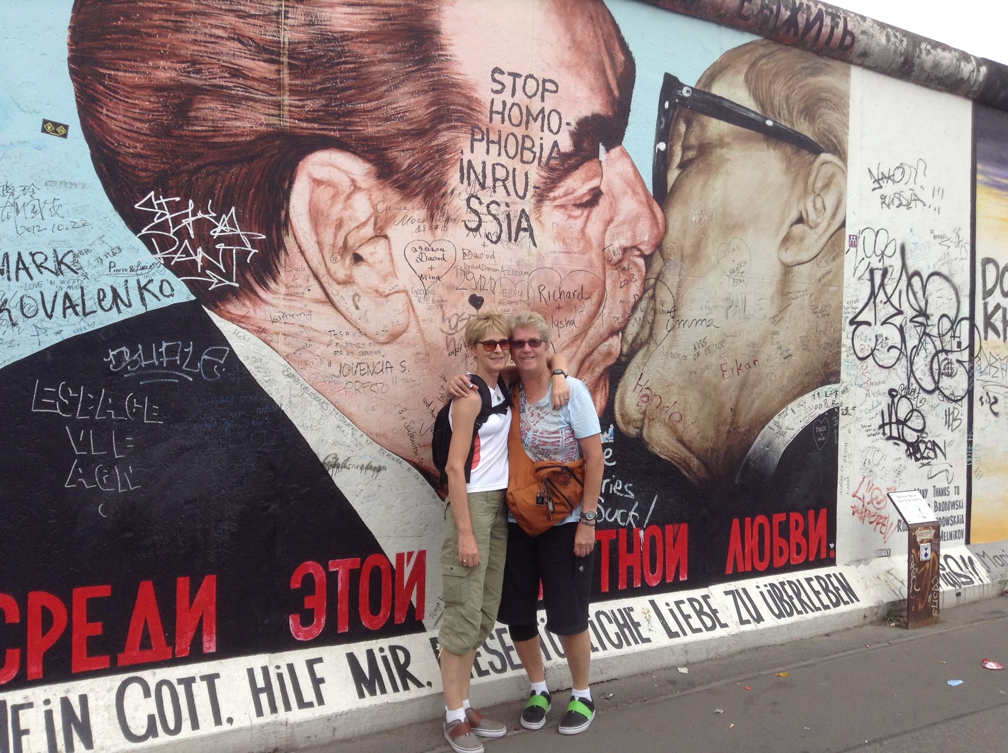 Along the Berlin Wall. A portion of this structure was left up. The blank concrete was soon covered with the most wonderful artwork, much of it political.And my favourite (we should have kissed to mimic the image but people were lined up to get their own photo taken so there was no time) The artwork is based on a photograph taken in 1979 during the 30th anniversary celebration of the German Democratic Republic’s foundation. Russian President Brezhnev is kissing the East German leader Eric Honecker. (Such displays were not uncommon in soviet bloc politics at the time) “My God, Help Me to Survive This Deadly Love” is the translation of the text. Artist: Dmitri Vrubel