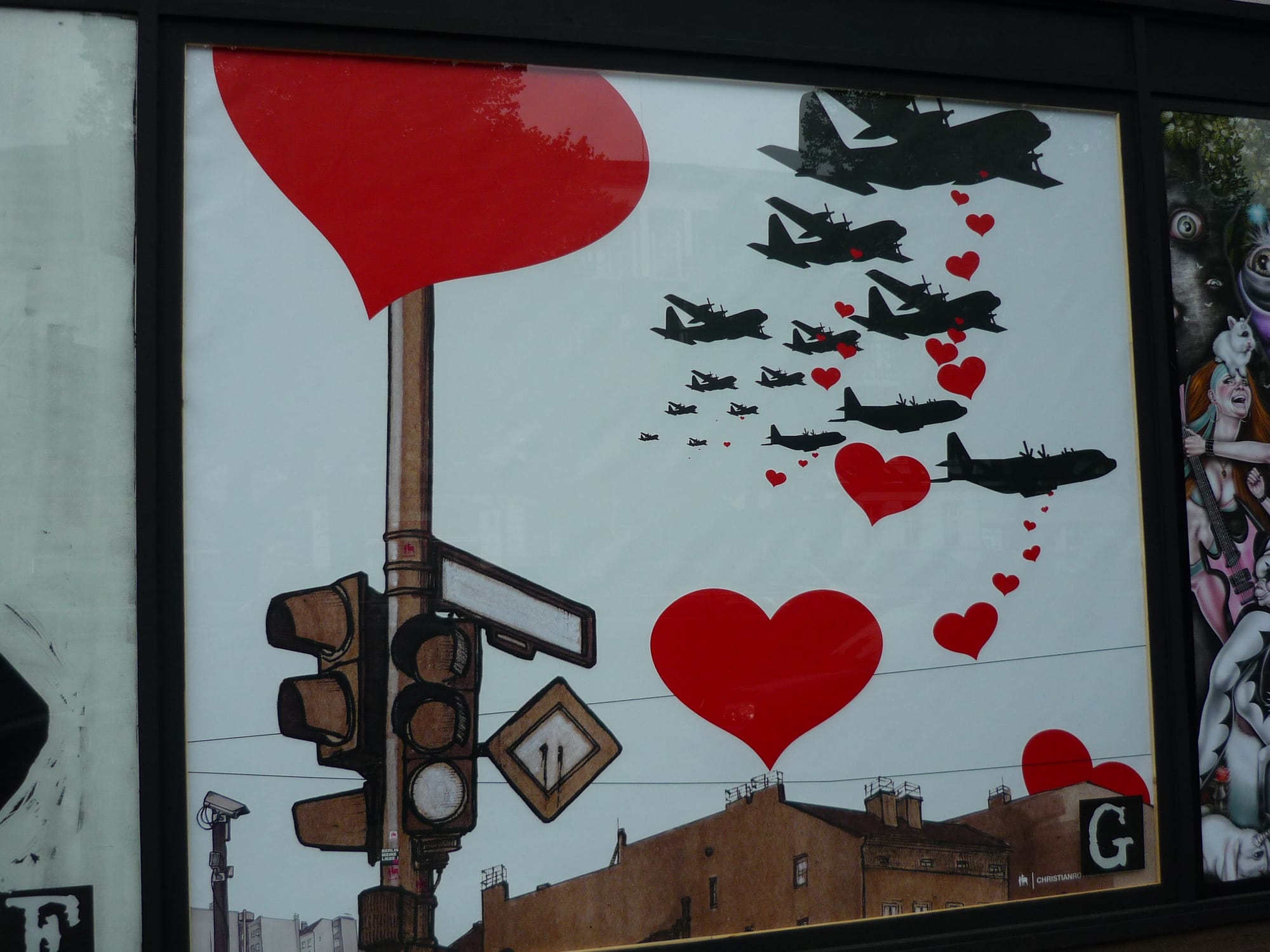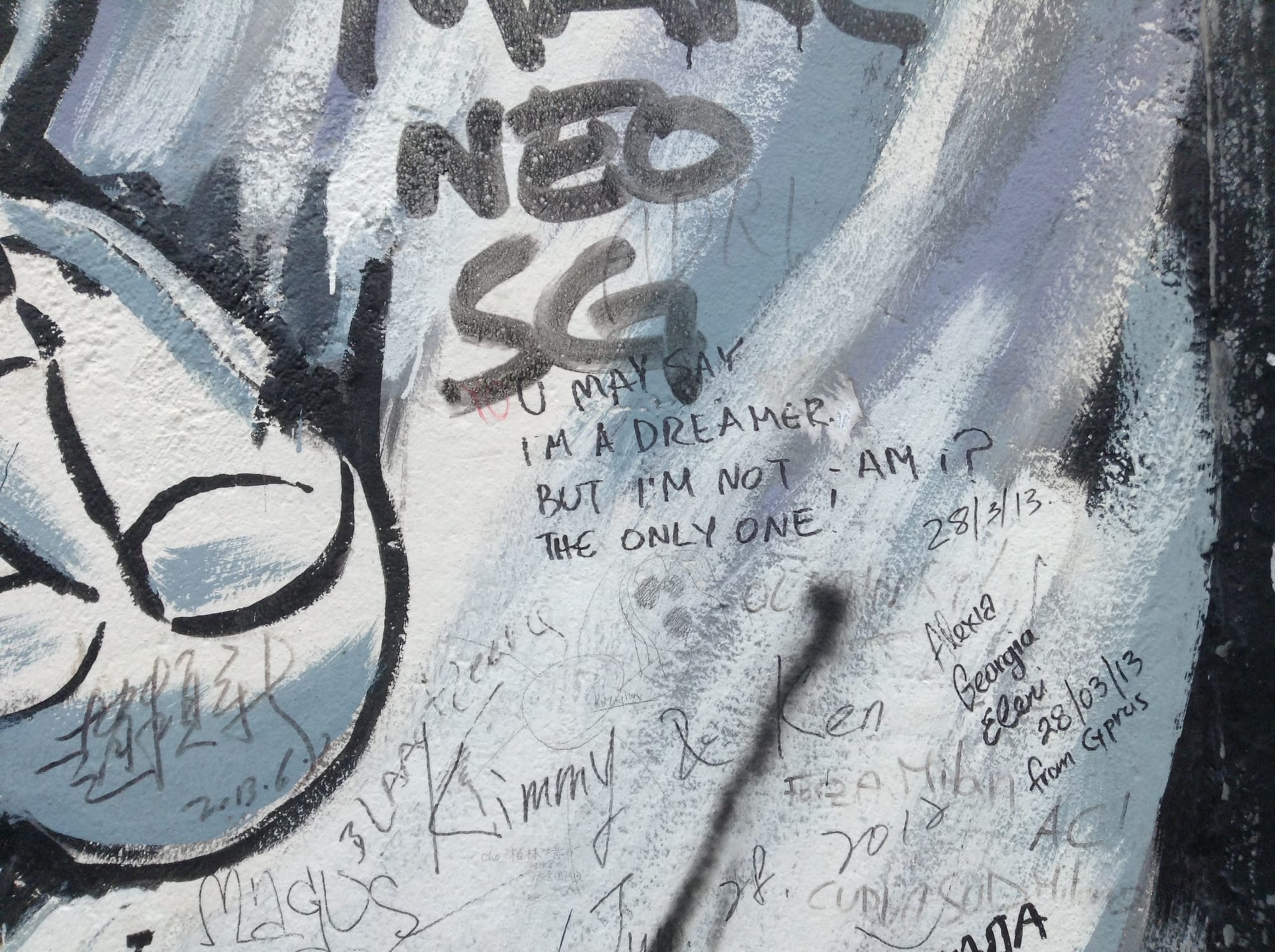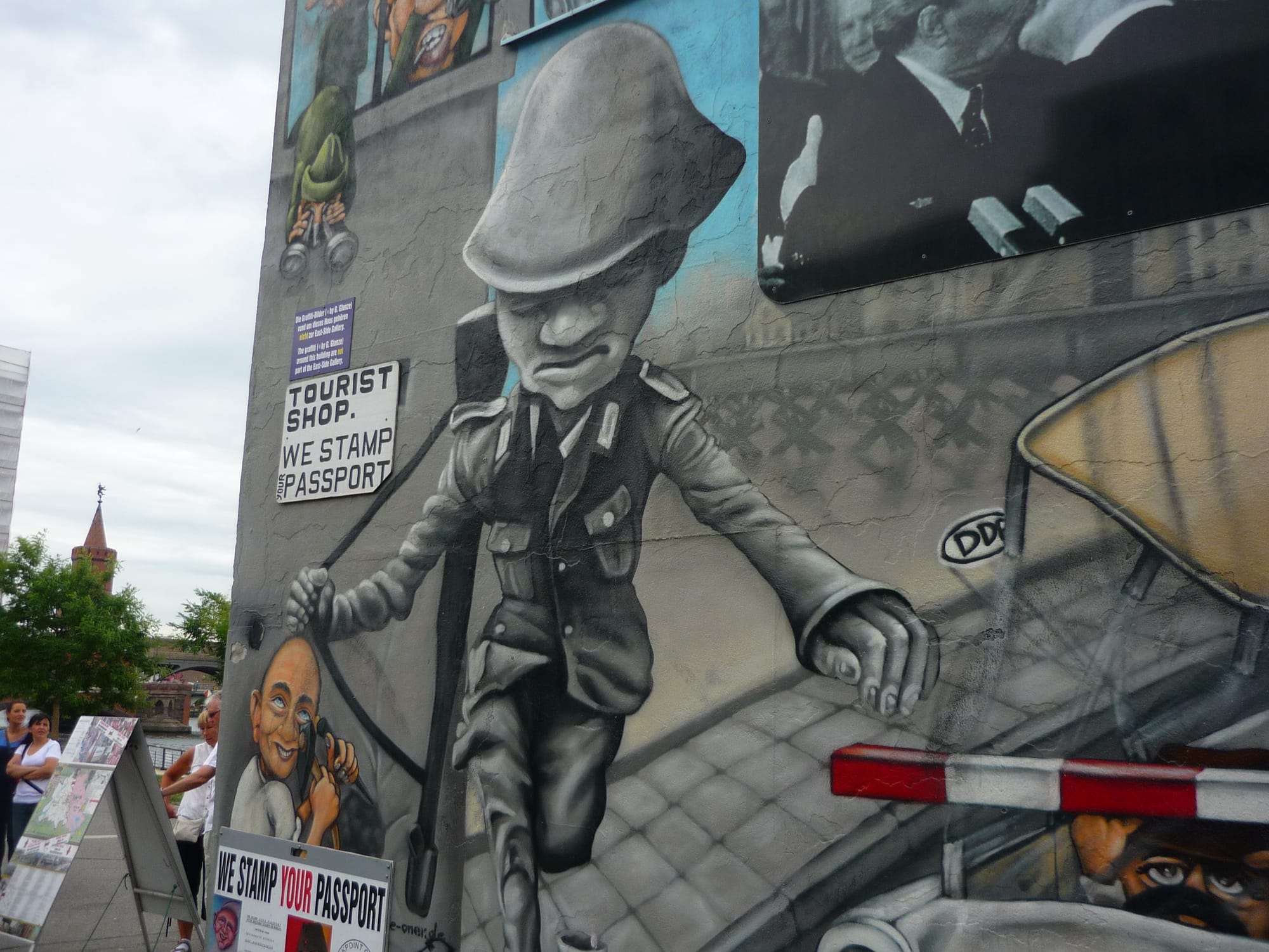 Along the Berlin Wall. A portion of this structure was left up. The blank concrete was soon covered with the most wonderful artwork, much of it political.And my favourite (we should have kissed to mimic the image but people were lined up to get their own photo taken so there was no time) The artwork is based on a photograph taken in 1979 during the 30th anniversary celebration of the German Democratic Republic’s foundation. Russian President Brezhnev is kissing the East German leader Eric Honecker. (Such displays were not uncommon in soviet bloc politics at the time) “My God, Help Me to Survive This Deadly Love” is the translation of the text. Artist: Dmitri Vrubel