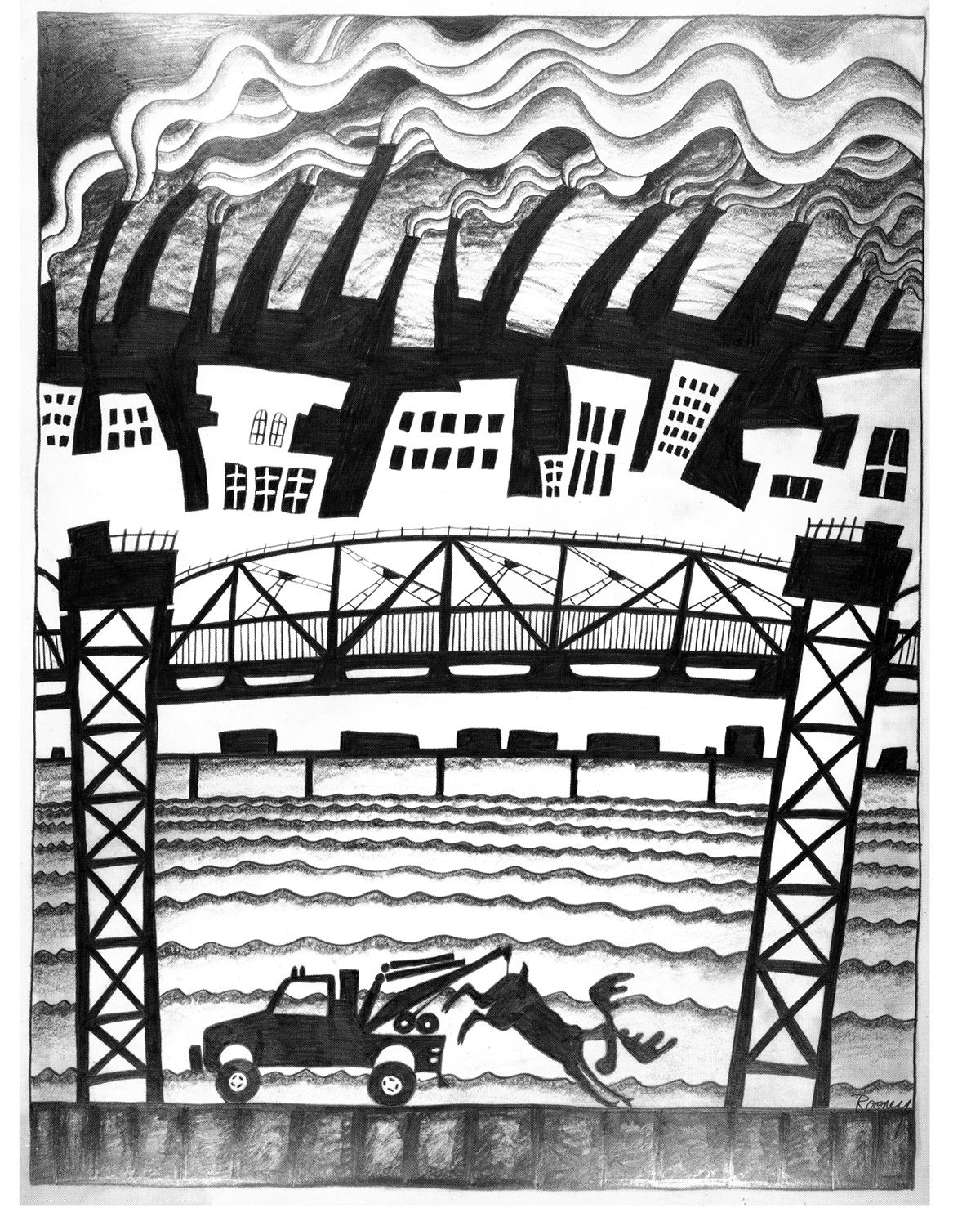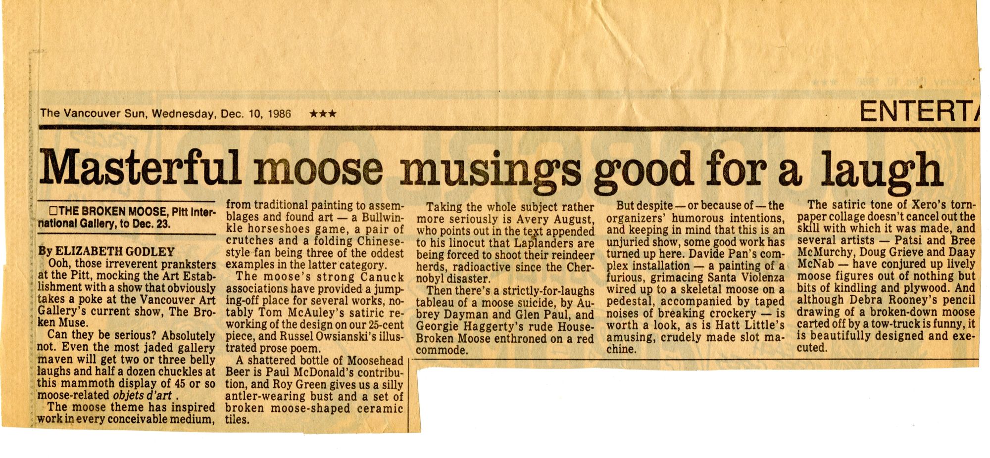 In 1986 the Vancouver Art Gallery put out a call for entries to a show they called "Broken Muse" to be shown in December of that year. A number of Emily Carr artists submitted work, all of which were rejected. The art community – the non-elites, that is – were tremendously pissed off and decided to hold their own show and run it at the same time as the VAG exhibition. They mockingly called it "Broken Moose" and invited anyone to submit work no matter who they were or how obscure or loopy, the only criteria was the subject matter had to be something to do with moose. The show was held in the dark basement of the Pitt Gallery and nobody who submitted was rejected. The result was a hilarious, irreverent, inventive and delightful collection of what can come out of the minds of a wild assortment of artists. There were paintings, paper maché, collages, writings, drawings, sculptures, installations, even a huge set of actual moose antlers, all poking fun at the insufferable snobbery of the VAG.