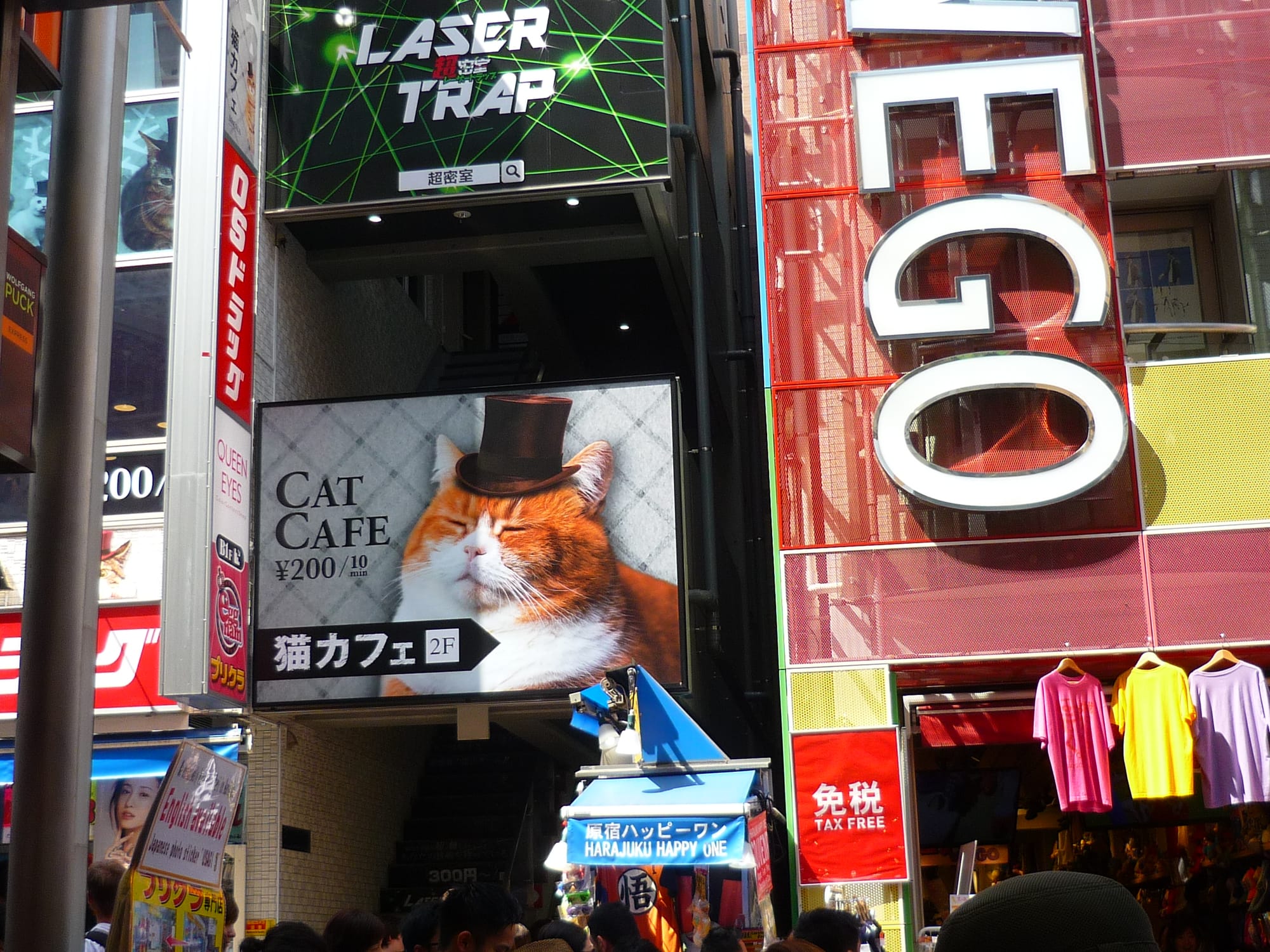 This was taken in the Shinjuku district, a wild cacophony of shops, giant stores, technology, blinking flashing neon and colossal signage. Interspersed with all this were 'Cat Cafes', quiet little oasis where one could, for a fee, enter and play with cats. Japan has an unusual relationship with cats. For example, it wouldn't be unusual to see a cat, fully dressed, in a stroller. Outside this particular cafe, you could buy a cat hat from a vending machine, presumably to adorn your temporary companion while you spent time with him or her.