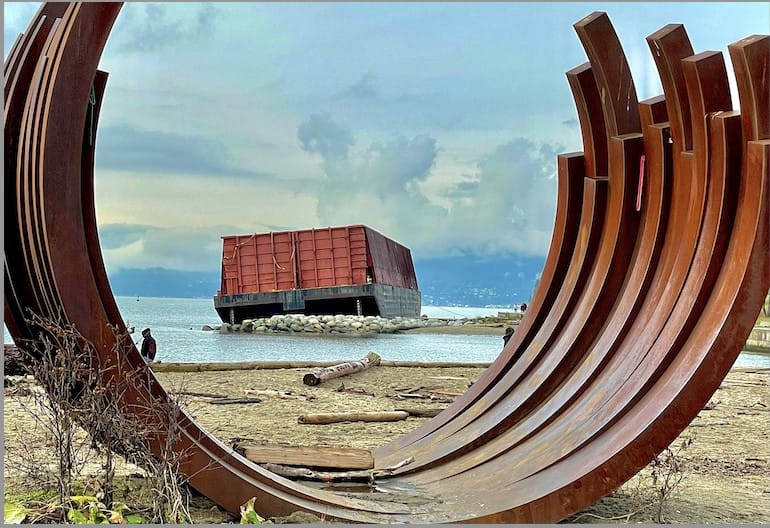 The barge, which was affectionately named 'Chilling Barge' (once it became clear it wasn't going to leave on its own), ran aground on Nov. 15, 2021. Strong winds, rough seas and a high tide caused it to break loose and drift, narrowly missing crashing into the Burrard Bridge, before running aground on this portion of English Bay. After attempts to refloat the barge failed, it became a fixture at the site. It was eventually dismantled and removed during the summer of 2022.
