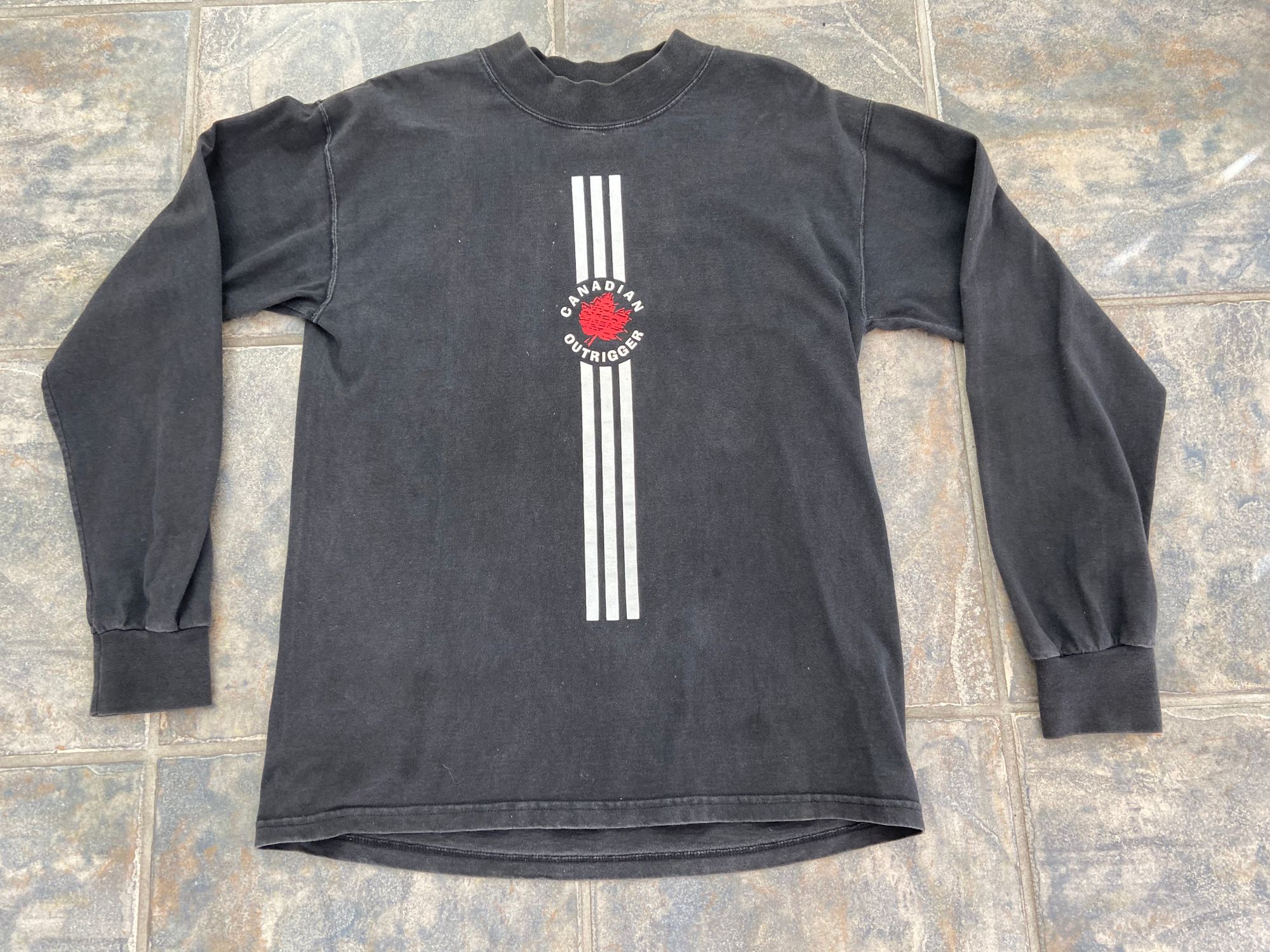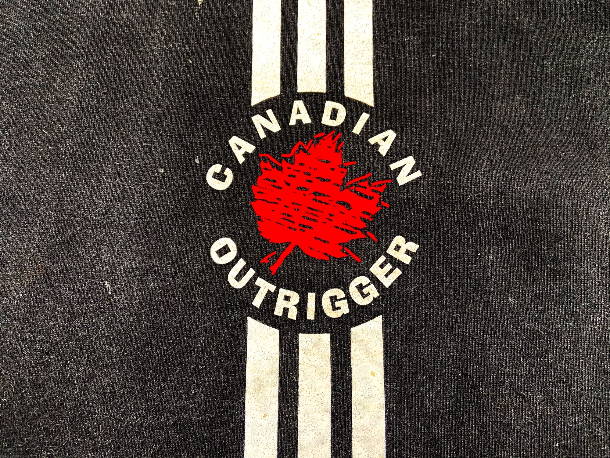 Most of the sports clothing I designed were for dragon boat or outrigger teams with which I was associated. This was one of the first uniforms that the senior women's outrigger team had me do. They wanted three stripes (a bit of an Adidas copy but that's what they wanted) I found a maple leaf in a park and roughed it up a bit, then took a high contrast shot of it with the line camera, then did the circular text with letraset ["Adlib" font for you ex-printers] and assembled the three components in a layout. I wanted to use the leaf with "Canadian, Eh?" on the upper back but the team didn't have enough money to silkscreen both sides so that didn't get used. (Darn, I thought it was pretty clever). The shirt looks grey here but it was actually black when new. My payment for any of these designs was one of the uniforms for myself, in my size.