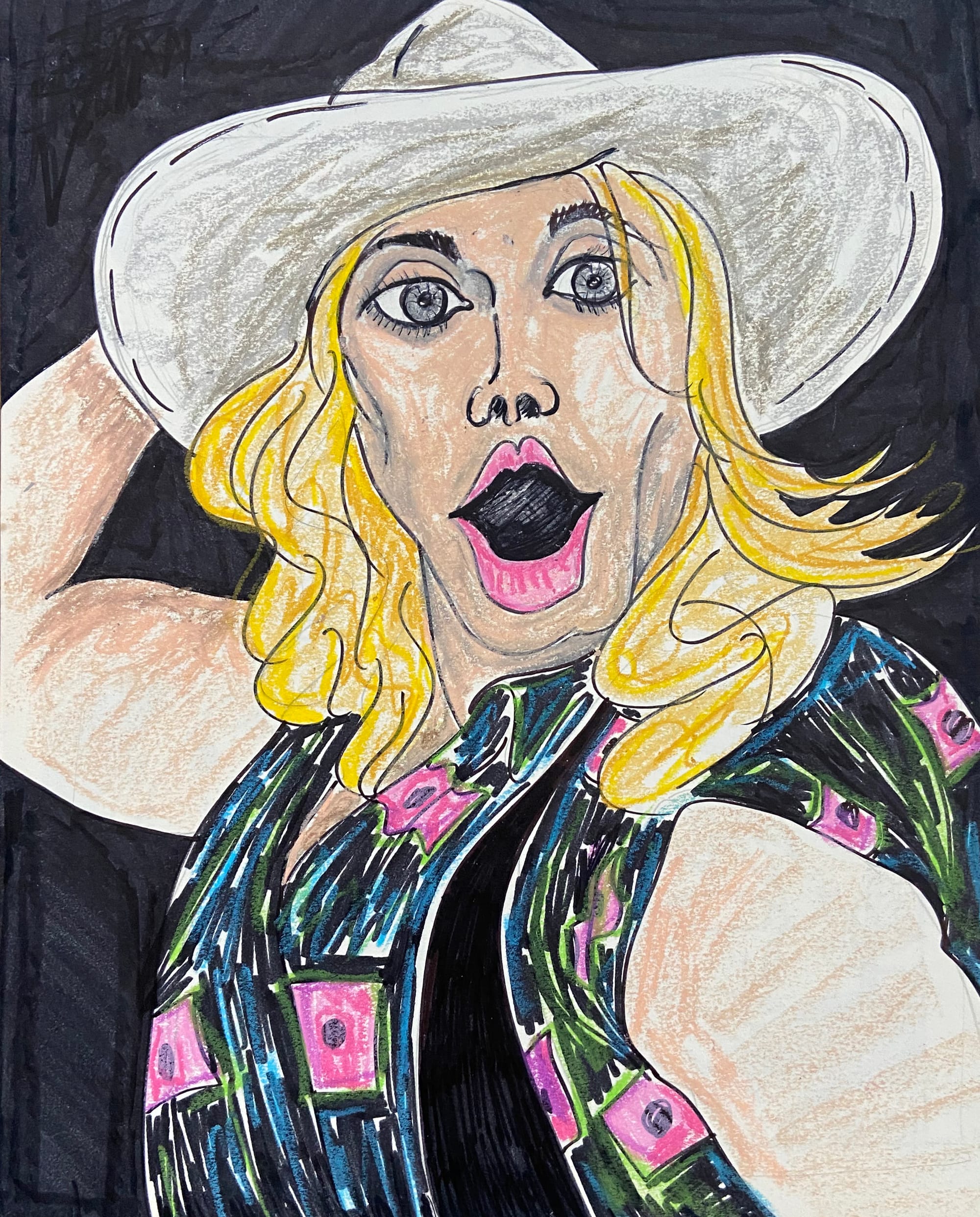 A caricature/portrait of David Lee Roth who was front man for Van Halen during the 70s until he was replaced by Sammy Hagar because Roth was such a prick. He was still a better front man than Hagar. Actually they were all pricks except Eddie Van Halen who was an awesome guitar player and slightly less of a prick. Van Halen was a great rock band if you could ignore the awful lyrics.