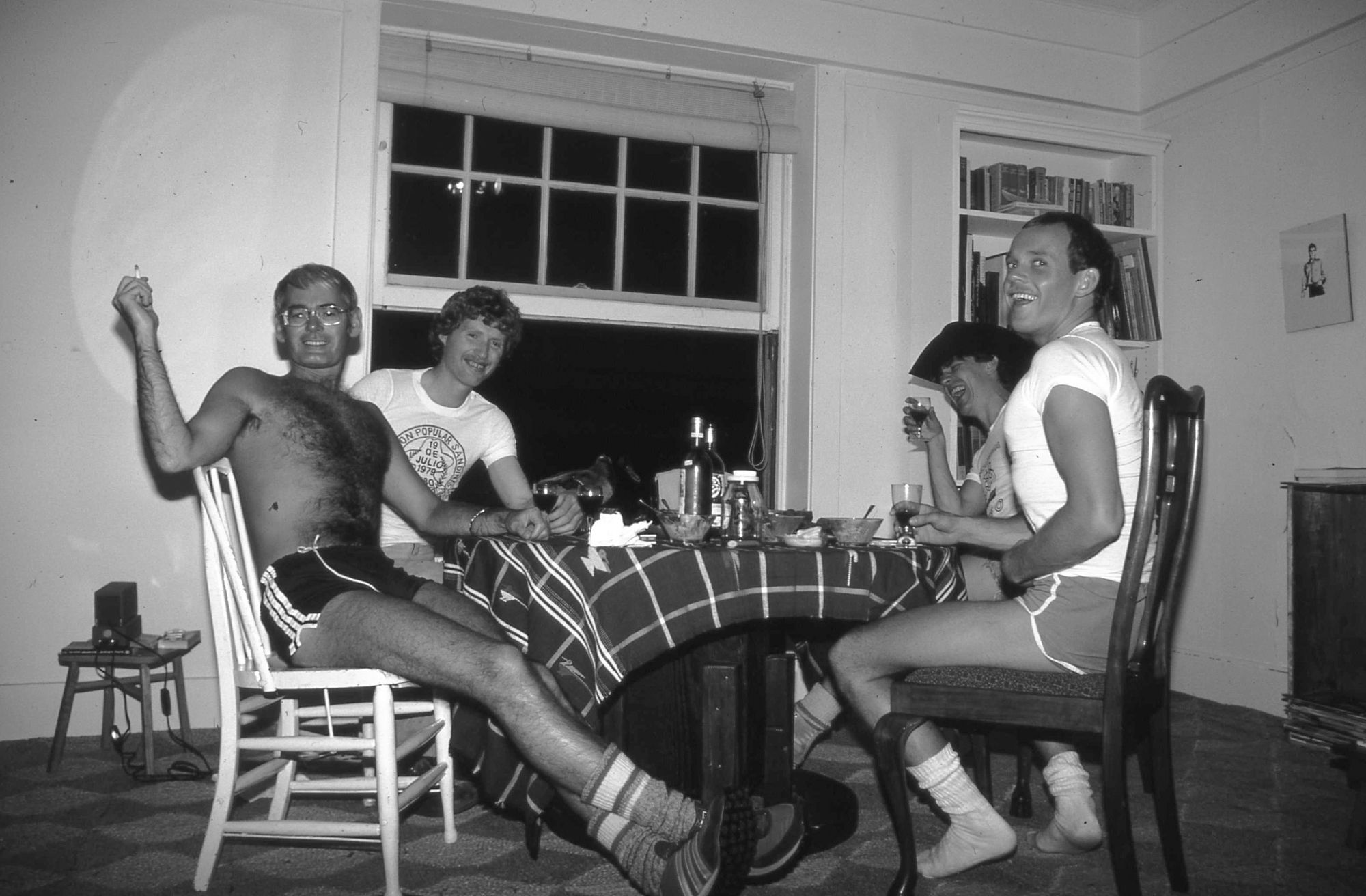 Since Gary was the best cook at the Banffshire and #503 was the better all-around place to host dinner parties, there were a lot of dinner parties held at Stephen and Gary's. Discussions could range from politics, to jobs, to gossip, to movies, to who'd had sex with whom [and where], to books, to where to buy the best espresso, to who WANTED to have sex with whom and so on and it all happened around their big round glass-topped dining table. Below: Maurice, Ian, Stephen and Glen. (Gary was probably hunting for the next bottle of wine) This must have been a hot summer evening given the light attire and the window sash being all the way up.