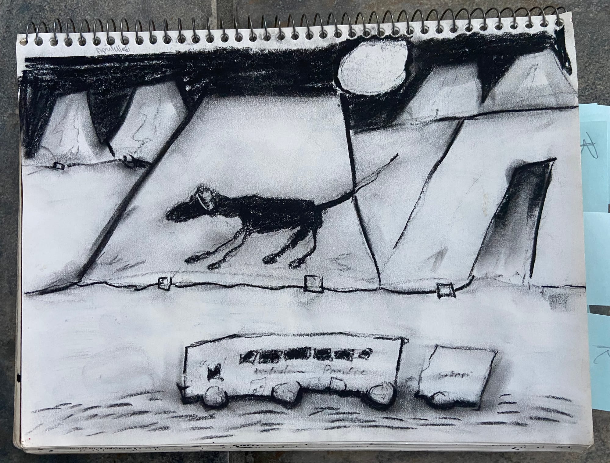 I've always been intrigued by people who say they can't draw because if you give them the right materials and deliver the right amount of bullying/encouragement, they can surprise you with what they'll come up with. My mom drew this. She had been on an Elder Tour to Australia several years before, camping in the outback, so I gave her a sketchbook and her choice of drawing materials and told her to draw something about that trip. Oddly enough she chose charcoal. This was her interpretation of the tents, the bus they travelled in and how she thought she heard dingoes in the night. I was surprised that a) she filled the entire page and b) she completed this in a less than half an hour. No erasing, no fussing, just right out of her head with no hesitation. (Maybe it was the vodka tonic). I think it's delightfully uninhibited.