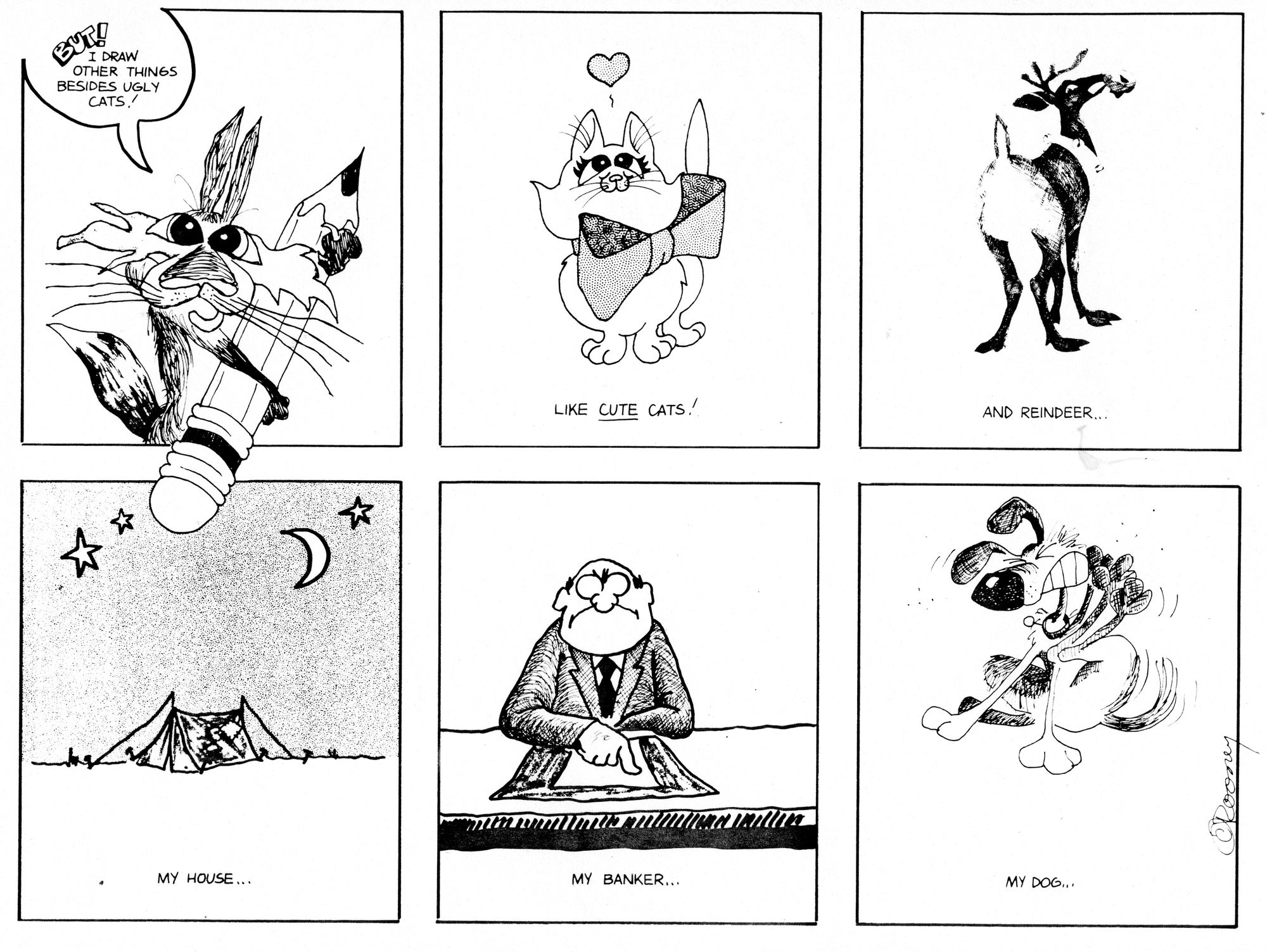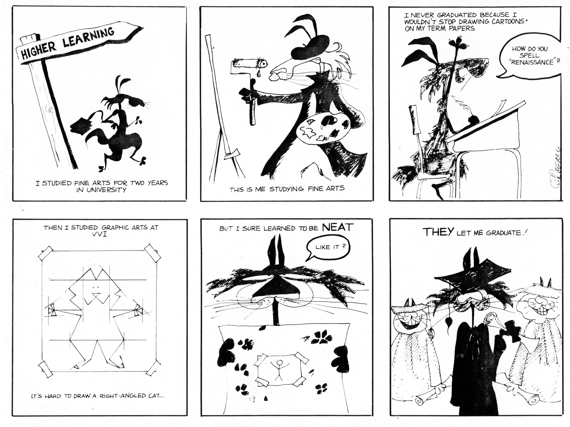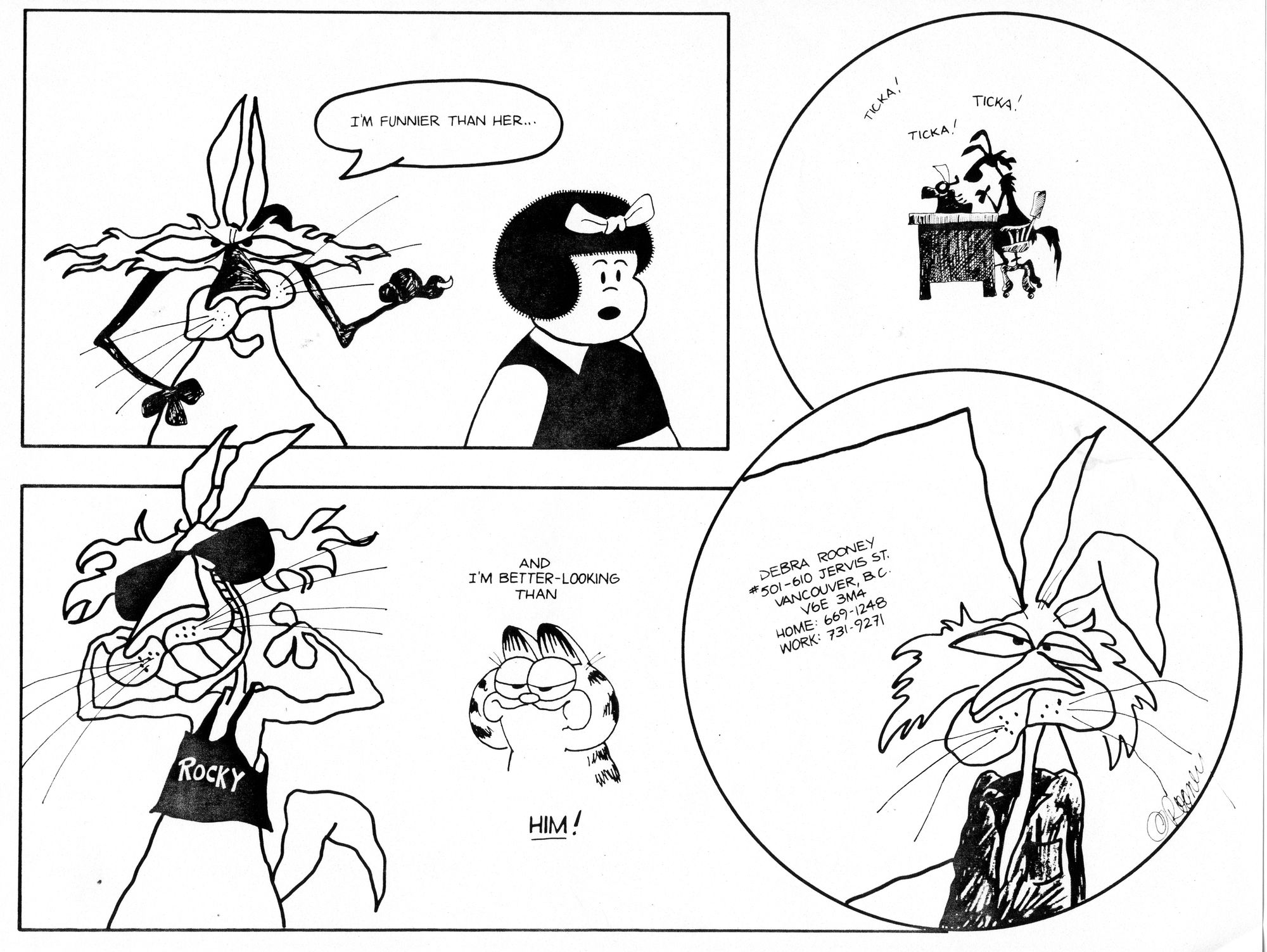 Sometime in the early 80s, the North Shore News advertised for a cartoonist. Such an opportunity, even at a small local paper, was unheard of so of course I applied. Rather than just do text with a few samples, I made the whole application a strip, designed to show off my witty range. I don't know who got the job and it's a good thing I didn't – the new hire was laid off within the year.