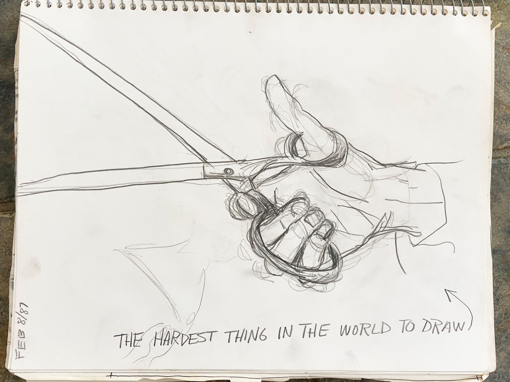 Just to really torture us, Carel had Ben hold a pair of shears in one hand, which we had to draw. Drawing a hand holding scissors is surprisingly hard to do (as is drawing a person on a bicycle. Fortunately, Ben did not have a bicycle).