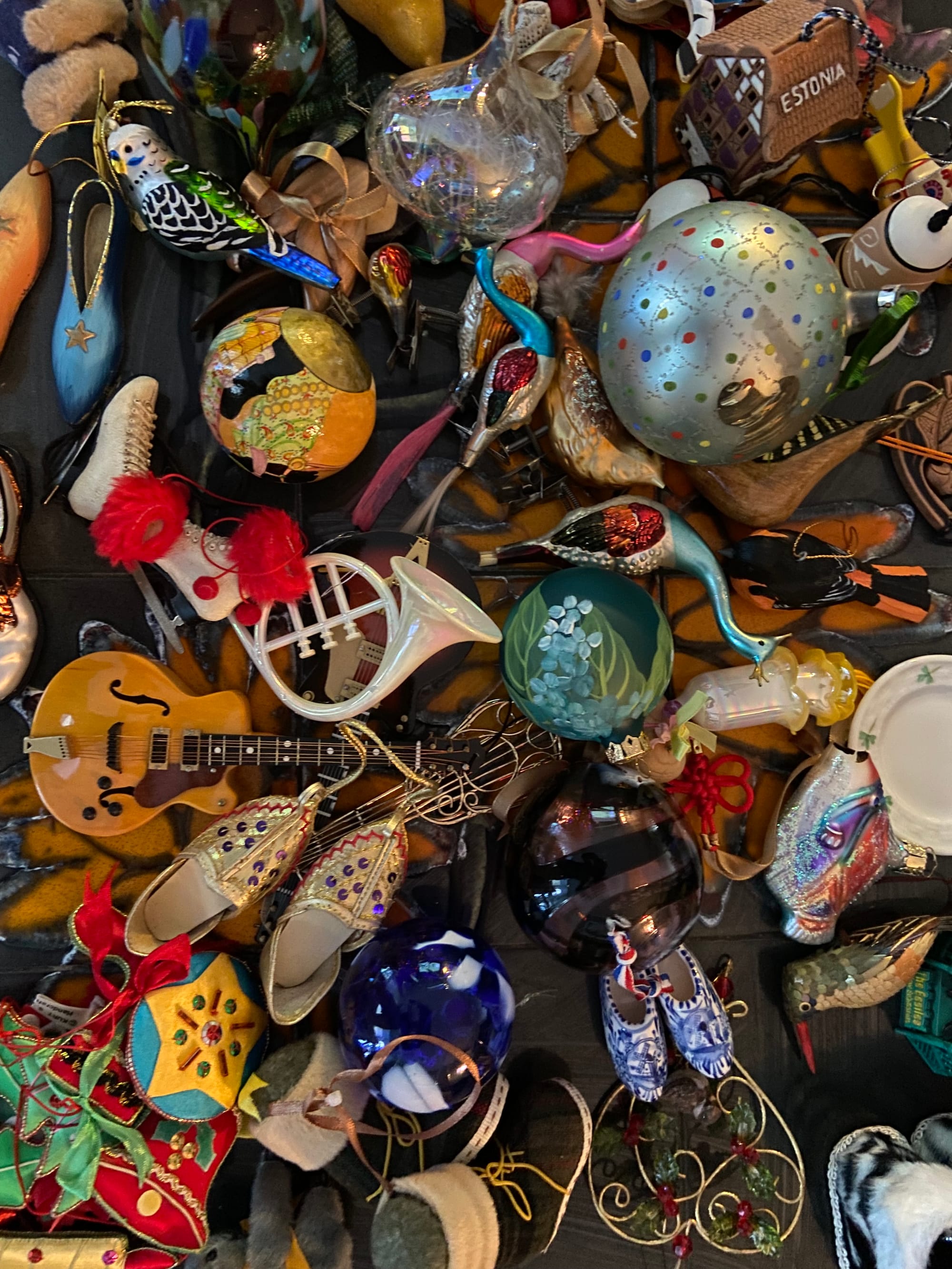 These are some of the ornaments we put on our tree every year. Some are from places we've travelled, some are gifts from friends, and some are from our past Christmas histories. The large silver ball and the peacock birds are from my childhood, saved over the decades and miraculously still in one piece. (sort of) The peacocks are missing most of their tails because when I was little, I couldn't resist seeing if I could pull them out.