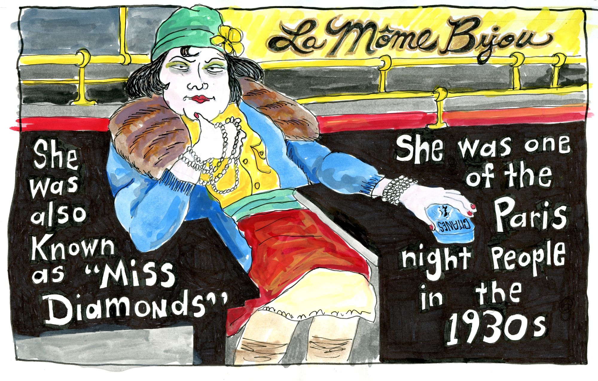 This is not a true story. Well, parts of it are true, but you'll have to guess which ones. I did this series over a couple of years experimenting with different materials – goache, watercolor, pen and ink, watercolor pencil crayon, even chalk pastel. I didn't mean to make a story until I saw that the different panels, with a bit of added text, could be woven into a story. La Mome Bijou (literally, 'The Jewell Kid') was featured in my favorite Brassai book of photographs, 'Brassai, The Secret Paris of the 30s'.