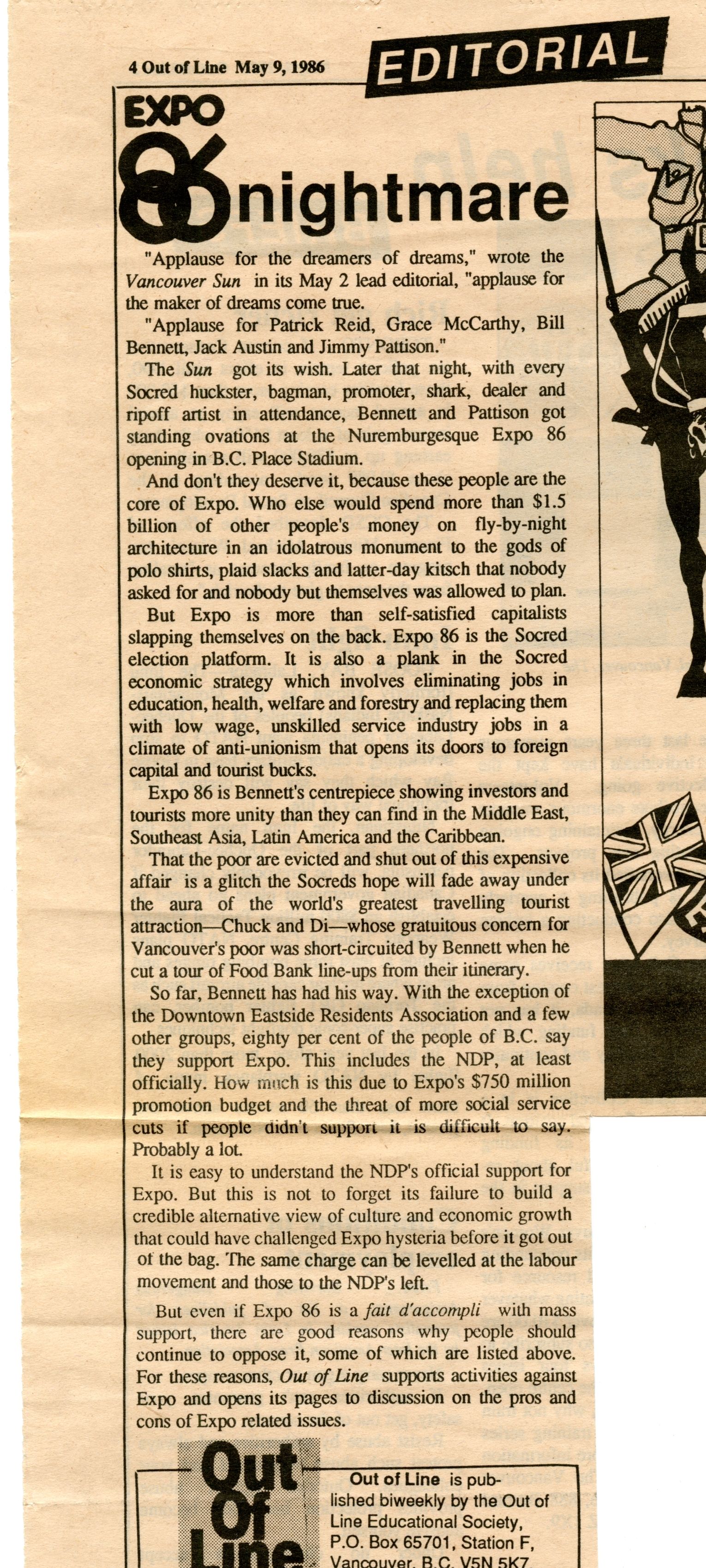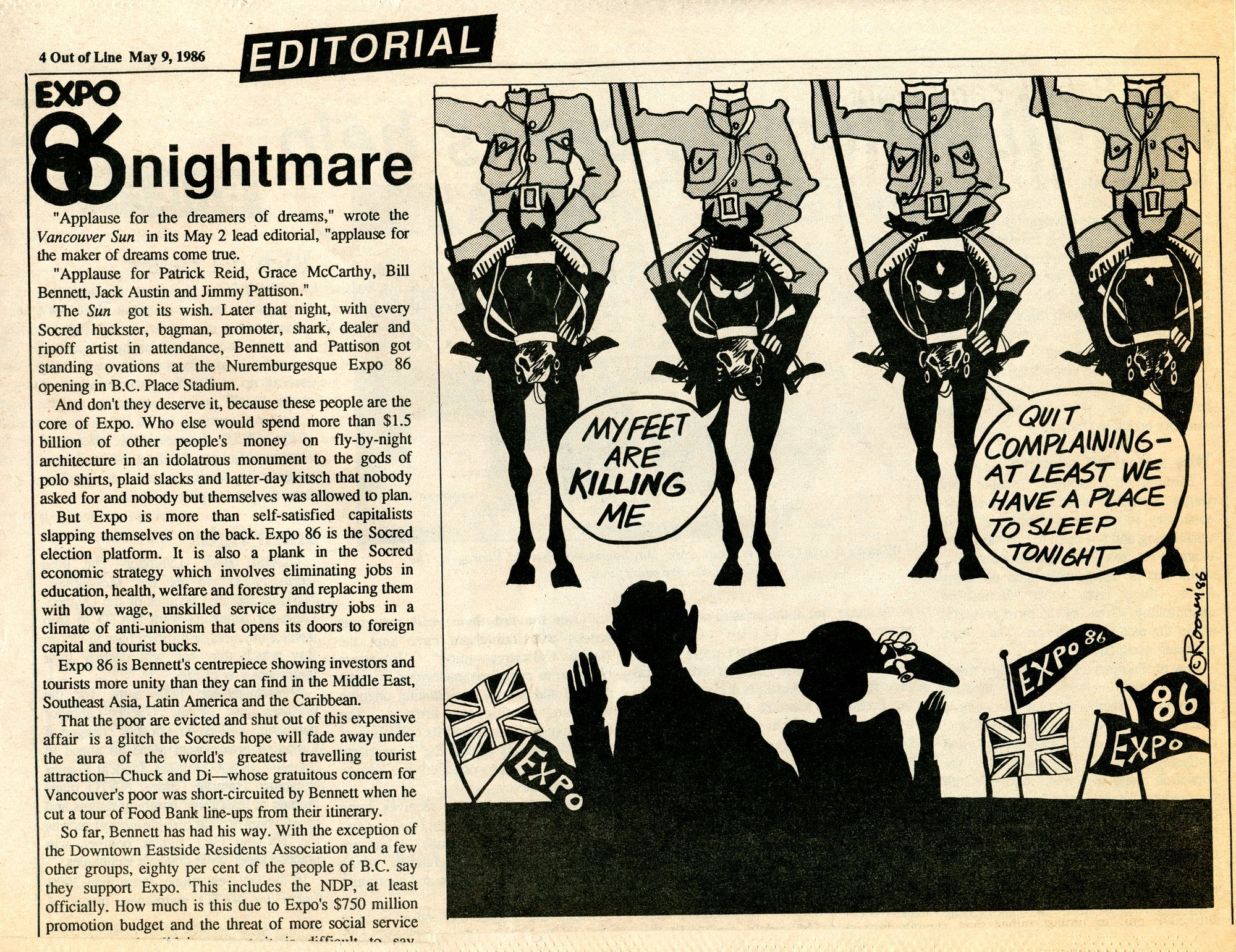 During the runup to Expo 86 and after it opened, rents skyrocketed throughout the lower mainland. Low income renters found themselves scrambling for new accommodation after being evicted so visitors could pay the exorbitant rents and the bottom enders, those who lived in SROs (single room occupancy), found themselves homeless and pushed out of sight. The world wanted to come see Expo '86, Vancouver was for sale and the stampede was on. We are still living with the aftereffects: leaky condos thrown up in the gold rush of relaxed, repealed or ignored building codes, union-busting. and rampant homelessness.