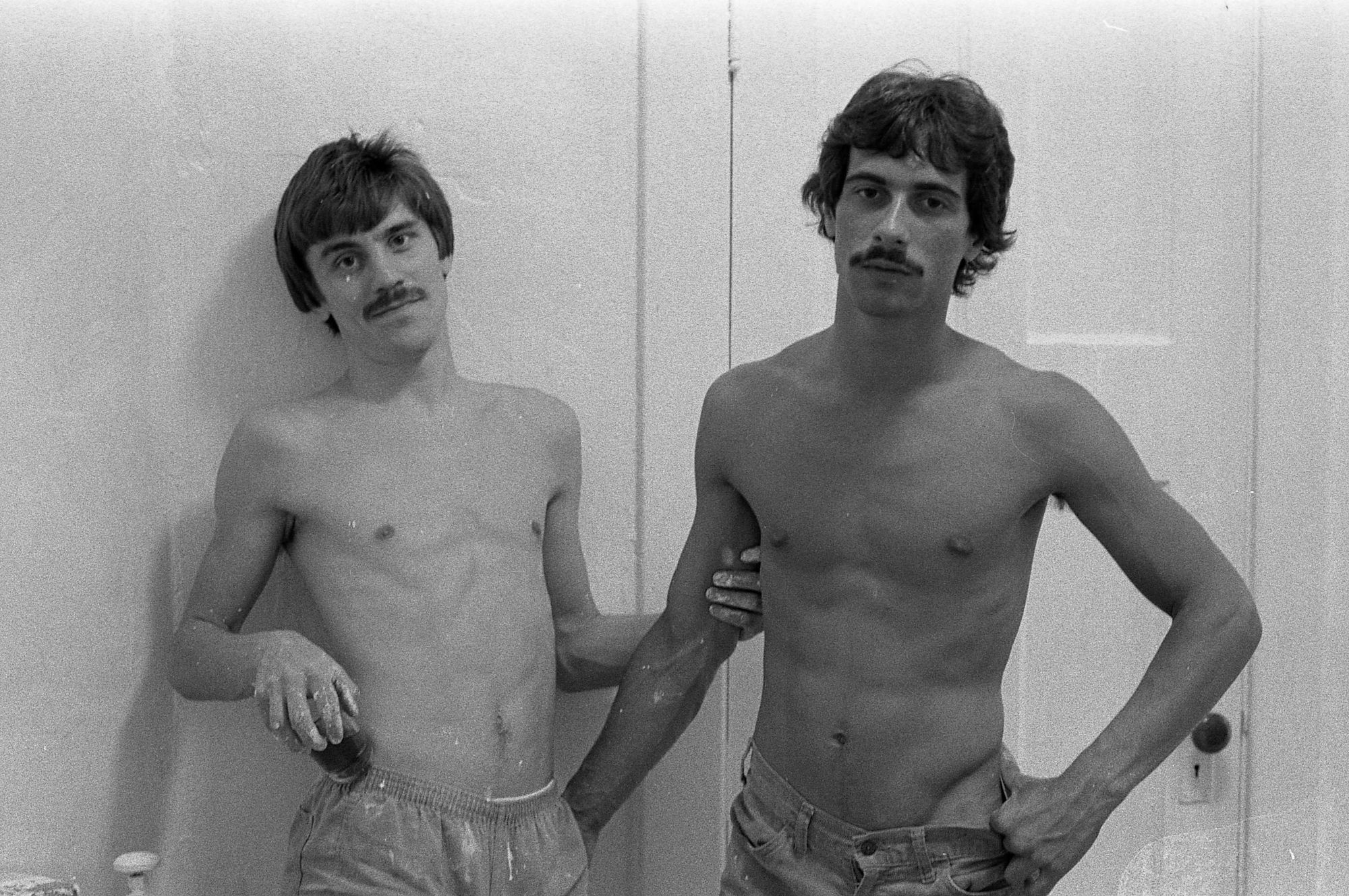 Stephen and Gary started out on the ground floor at the Banffshire and moved up within the year to the fifth, right across from me in 501. It was standard procedure when moving into a new apartment to paint right away, always white. Getting paint on one's clothes was pretty much a given, so it was best to wear less. (that's paint on Stephen's face, BTW, not dust on the neg) Painting at the Banffshire was a Tom Sawyer-ish affair, with wine instead of apples as an enticement.