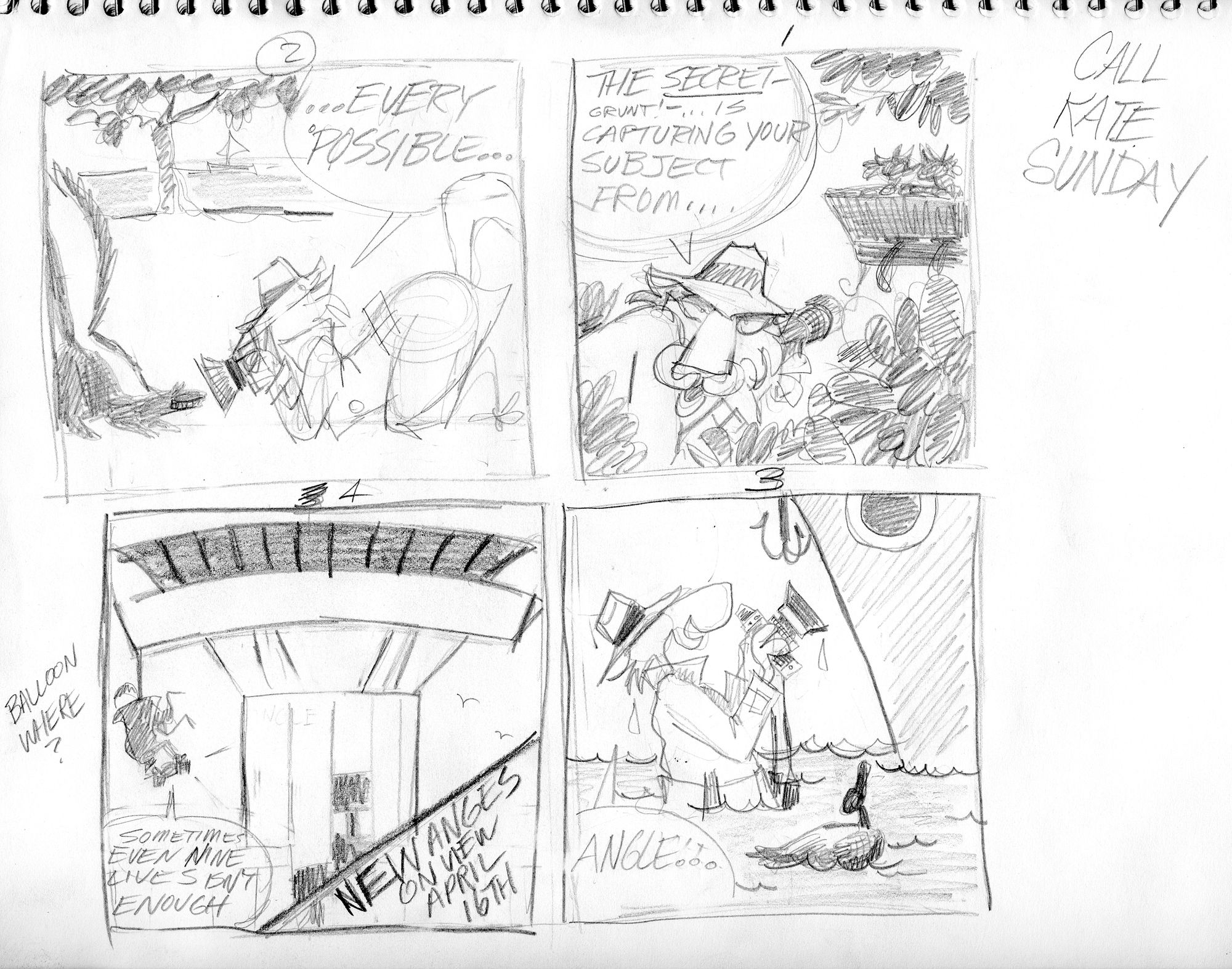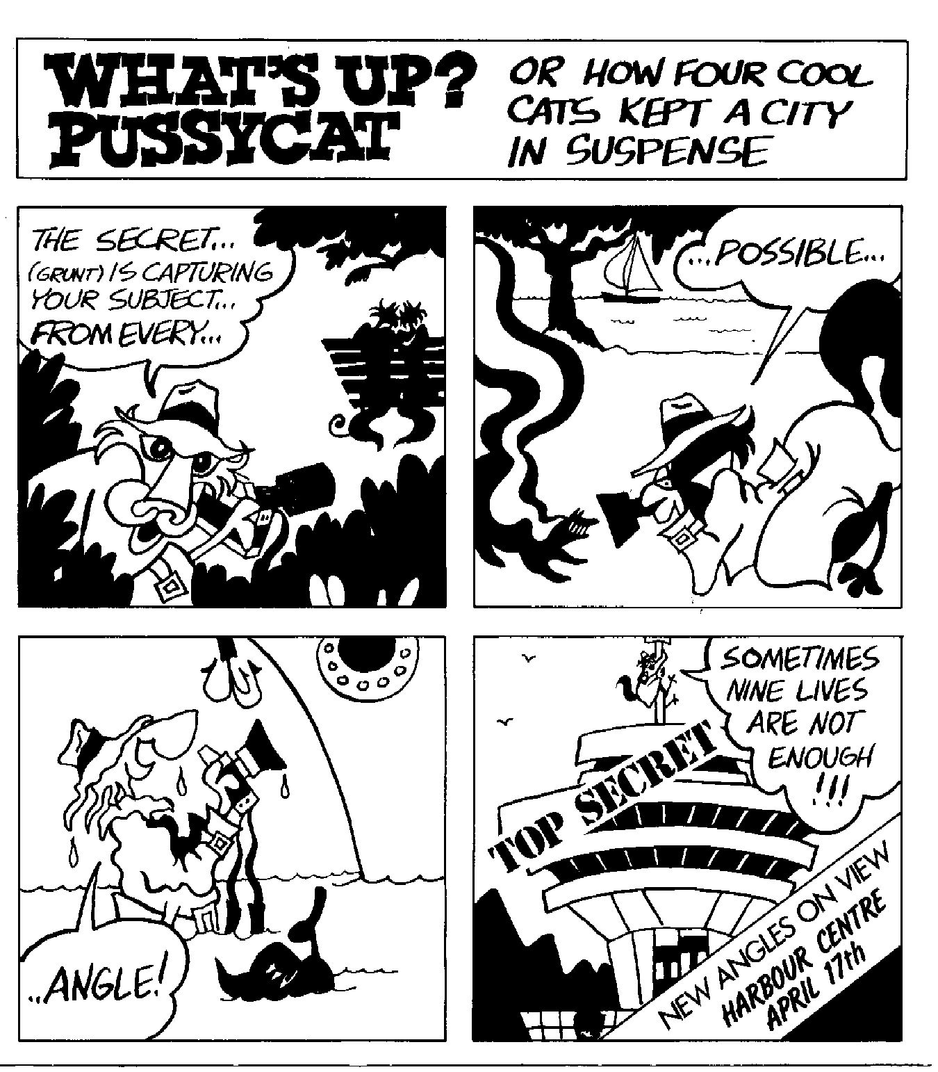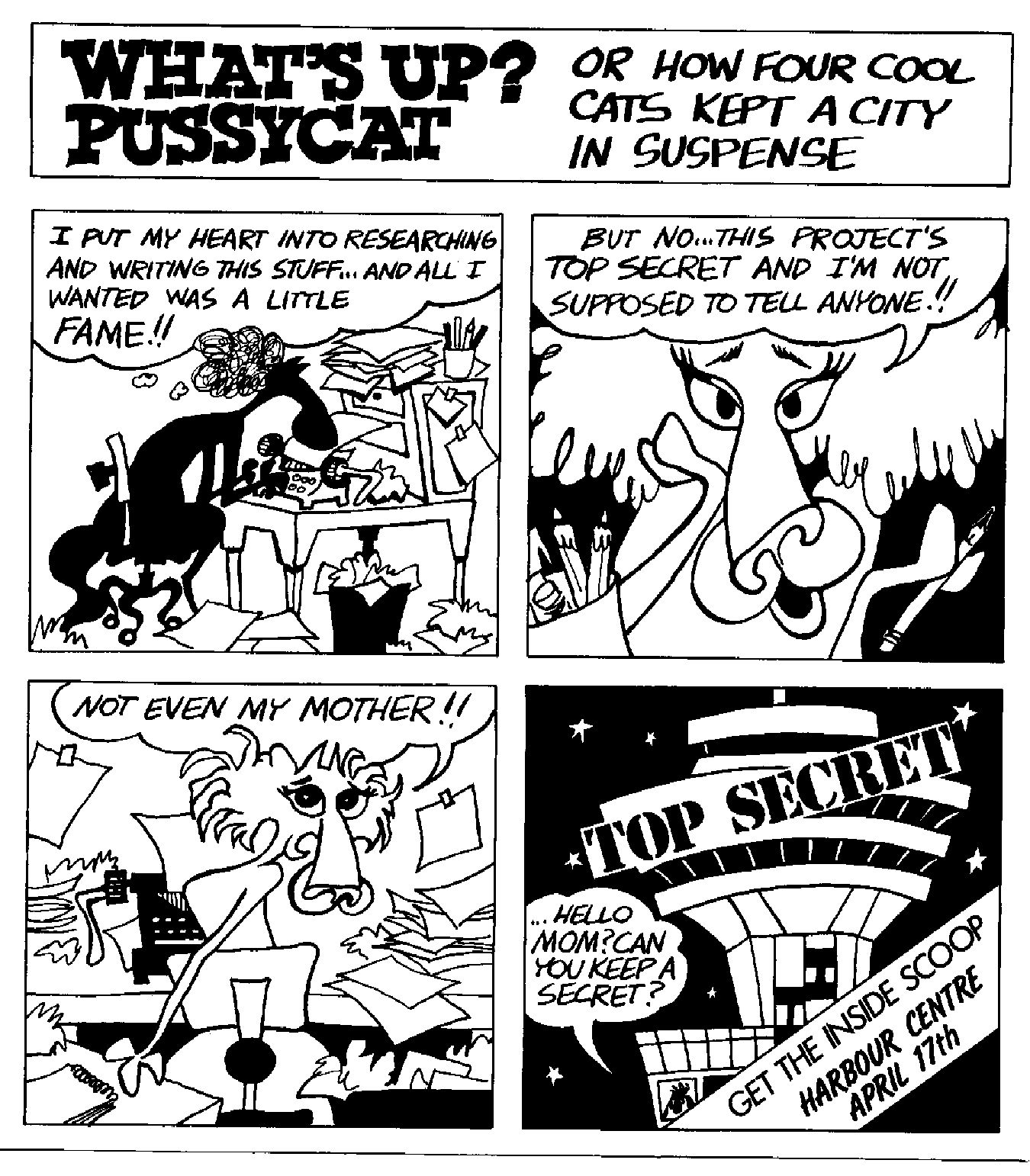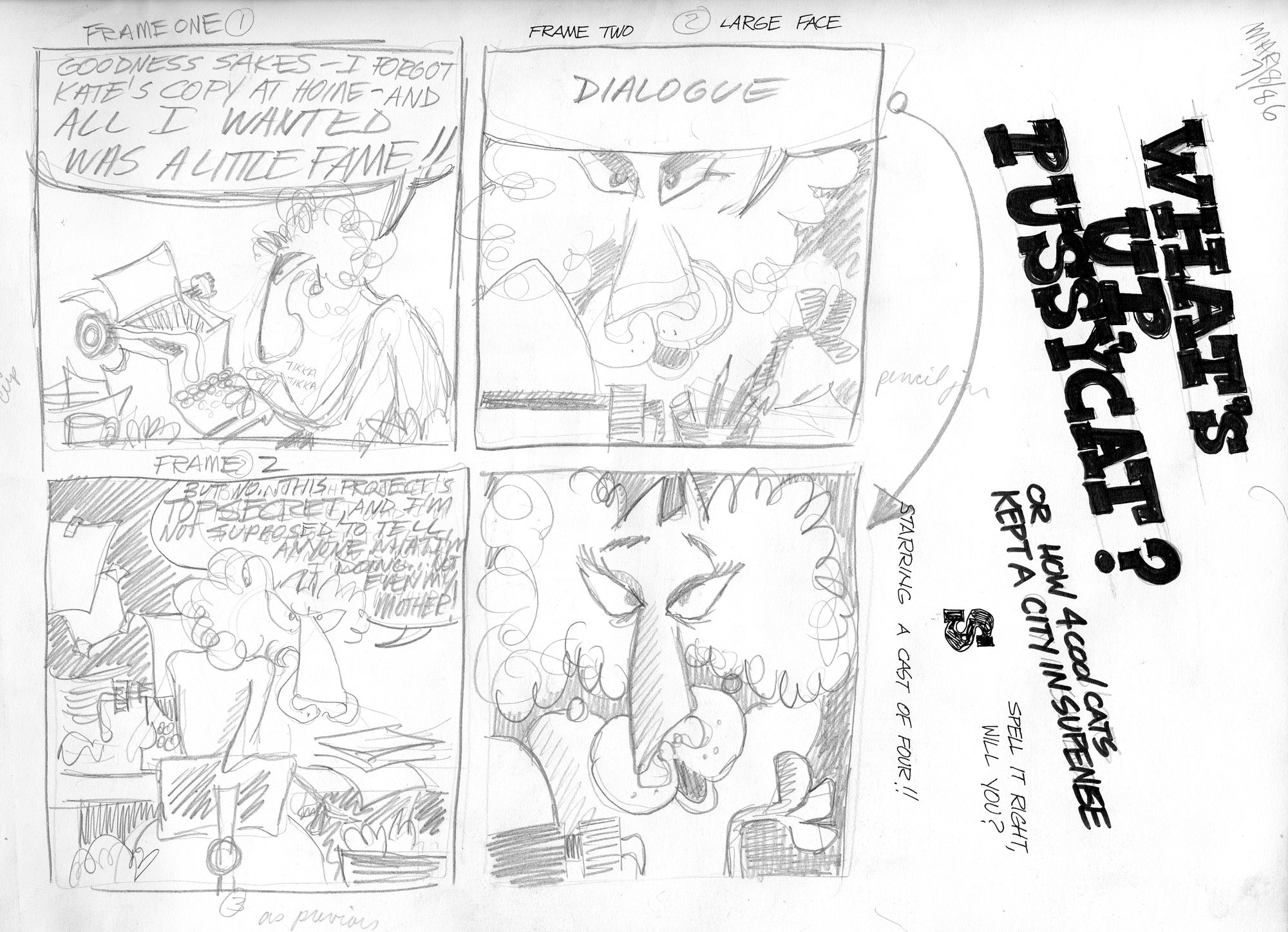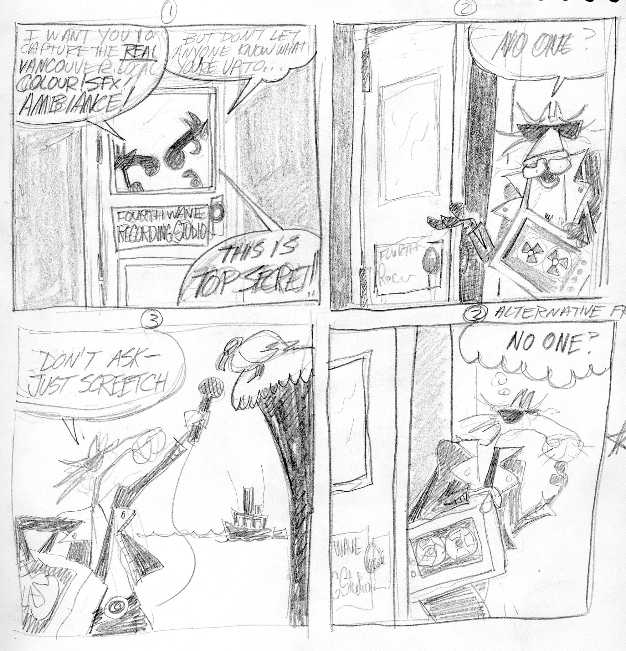 Circa 1986. These were roughs for a corporate client who shall remain nameless. (A 'rough' is something you might show a client so they get an idea of what the final product is going to look like. If they want changes you haven't wasted a bunch of time and effort re-doing finished artwork). As I began getting more paying jobs I was to discover that left-wing publications, unions and anything to do with government were upfront about what they'd pay and prompt in paying. Not so much with private businesses however, which could be nickel and dime-y, late in payment or downright dishonest. I once literally chased a client out the back door of his office to catch him and threaten legal action to get my fee. (I had no lawyer of course, but he bought the bluff to my great astonishment and relief) Below are a few of the character workups for that client, which was an ad campaign that went into the Vancouver Sun. I forget what on earth they were selling. It took endless hours to arrive at the final panels, even though the dialogue was written for me. The final artwork ran for four consecutive days in the newspaper. (For any of you who are counting, one of the panels has been lost).