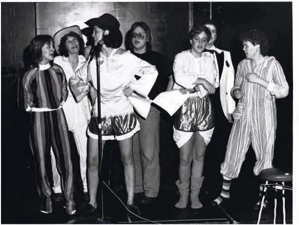 Every show must have a grand finale, which, in the case of a Quadra staff show, was a group song/general melee. At left is the whole troupe performing "Wasn't That a Party?" and at right we are singing lyrics I wrote to the tune of "Tip Toe Through the Tulips" ("Tip Toe Through the Quadra") As you can see, our costume department was admittedly a bit limited. Yes, that's me center stage in both closing numbers.