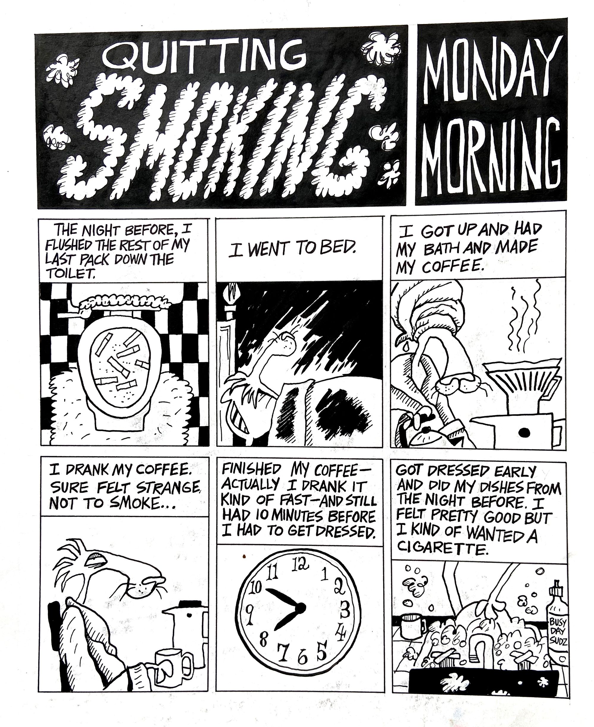 This was done in Martin Guderna's class – we were making a booklet of everybody's artwork and this was my contribution (based on sad but completely true events). Martin and the class (many of whom were smokers themselves) got a big kick out of it.
