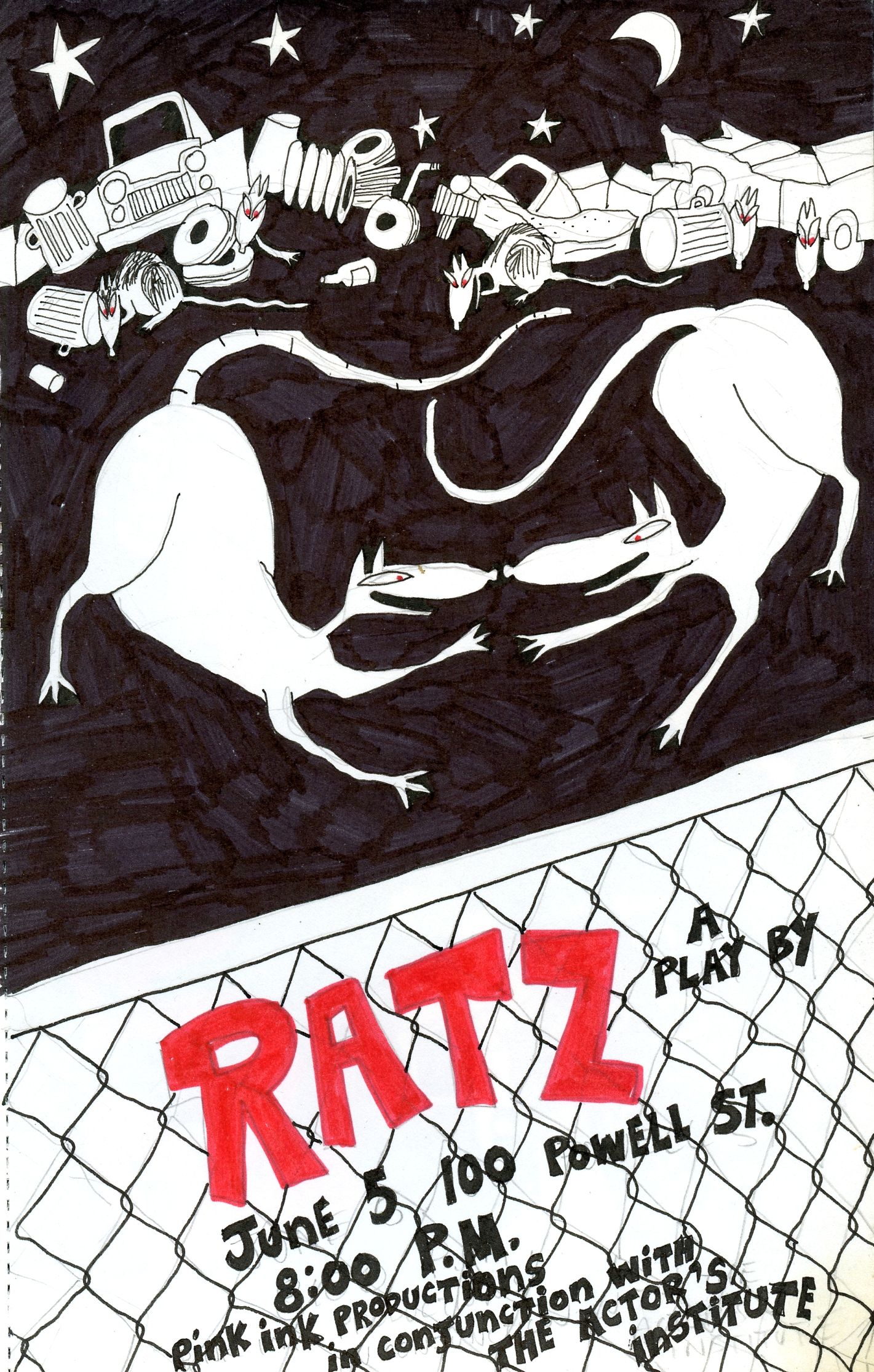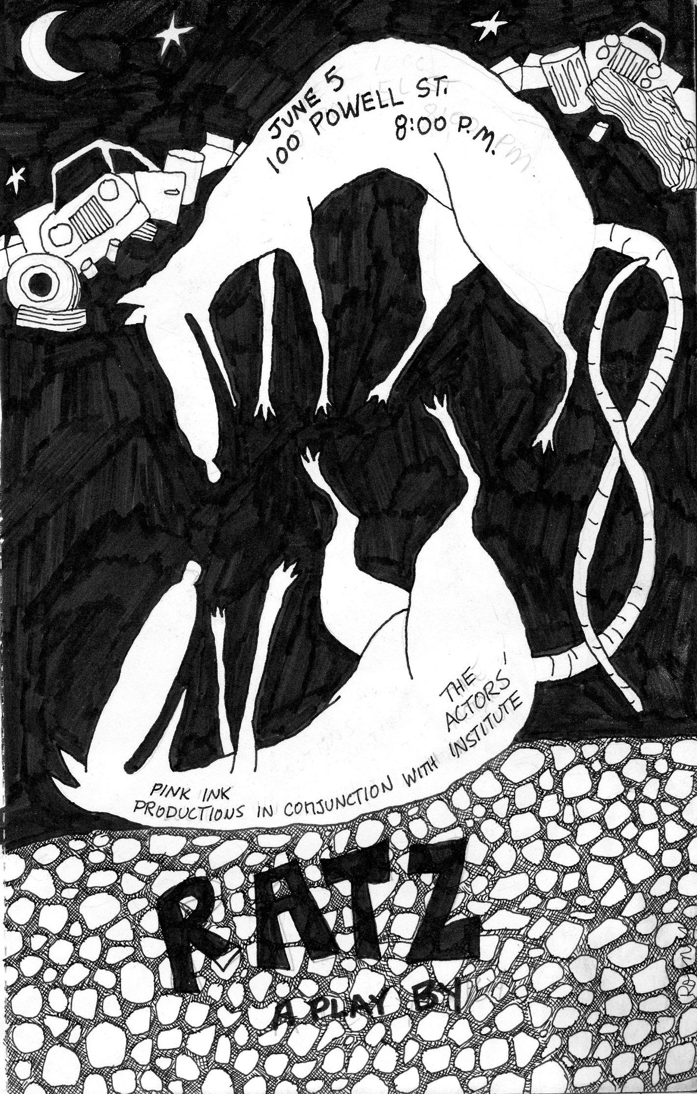 1985. The drawings I'd done in Jamaica (see earlier posts way back) went into a student art show at Emily Carr that same year. Someone saw them, liked the style and asked if I'd do the artwork for one of the plays in the Vancouver Theatre Festival. The play was called 'Ratz' by German playright Peter Turrini. These are two of the ideas I submitted for the poster.