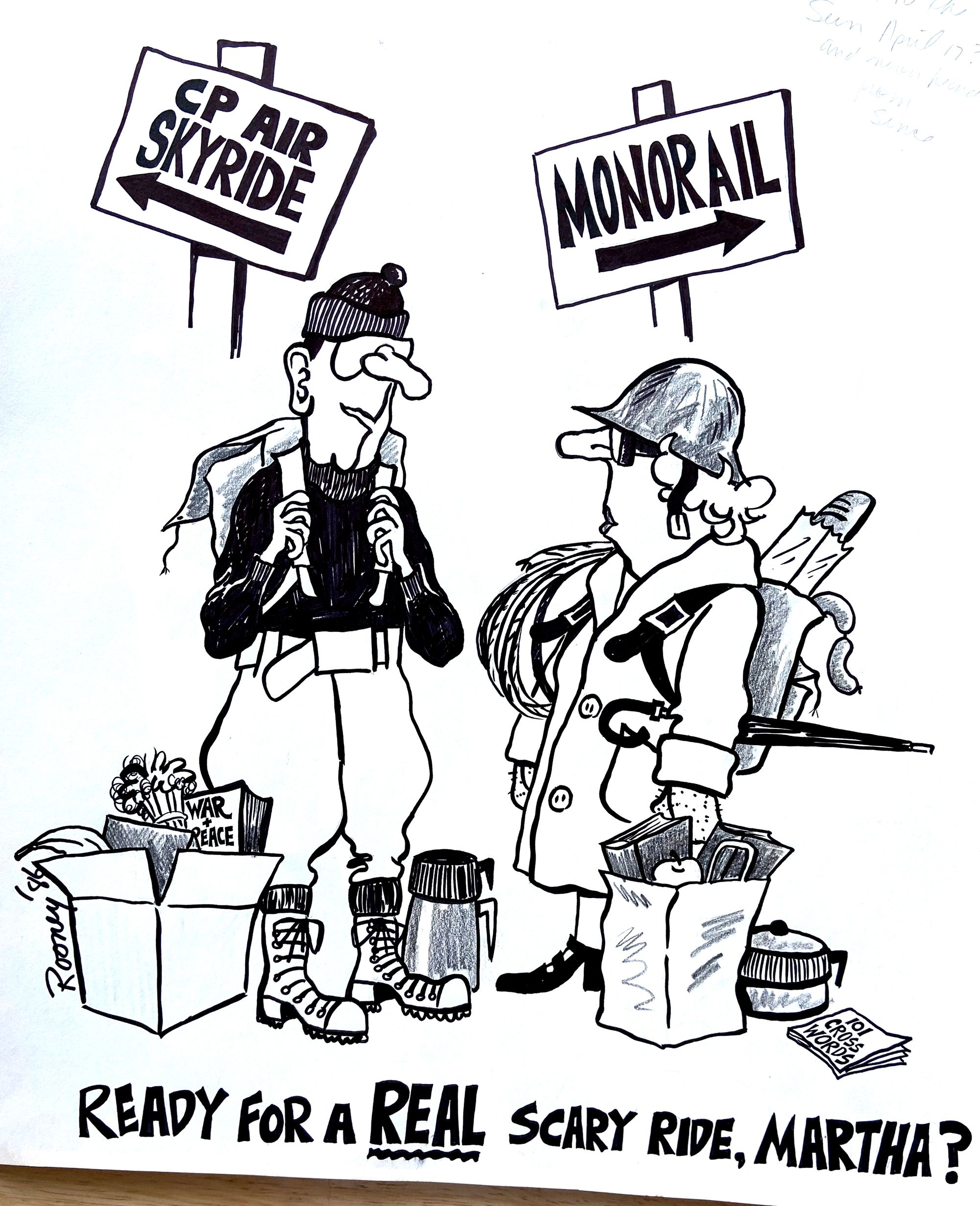 There was some sort of incident at Expo 86 regarding the monorail – I think it stalled and people got stranded for several hours. Nobody was seriously hurt, but it inspired a cartoon, which, emboldened by two previous cartoons that the Vancouver Sun had run, prompted me to send this one in AND ask for payment. They never responded, never ran it, and that was the end of any of my work appearing in the newspaper.
