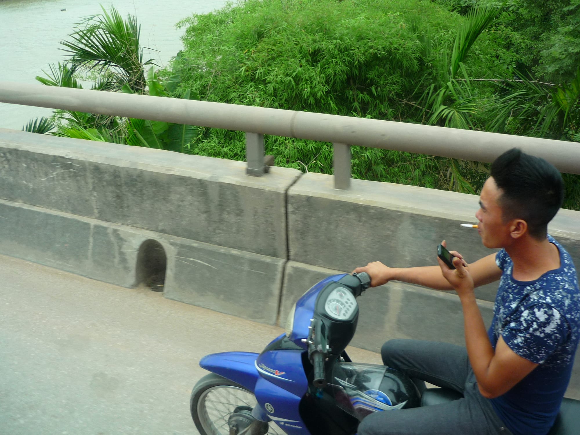 2017 This was taken on a highway somewhere outside Hoi An, Vietnam. The concept of road safety in Vietnam is hilariously ignored. People ride on staggeringly overloaded vehicles, entire families cling to fenders and helmets, if worn at all, are cheap plastic. Oddly enough, we never saw a single accident. Our bus passed this busy fellow, triple tasking at high speed.