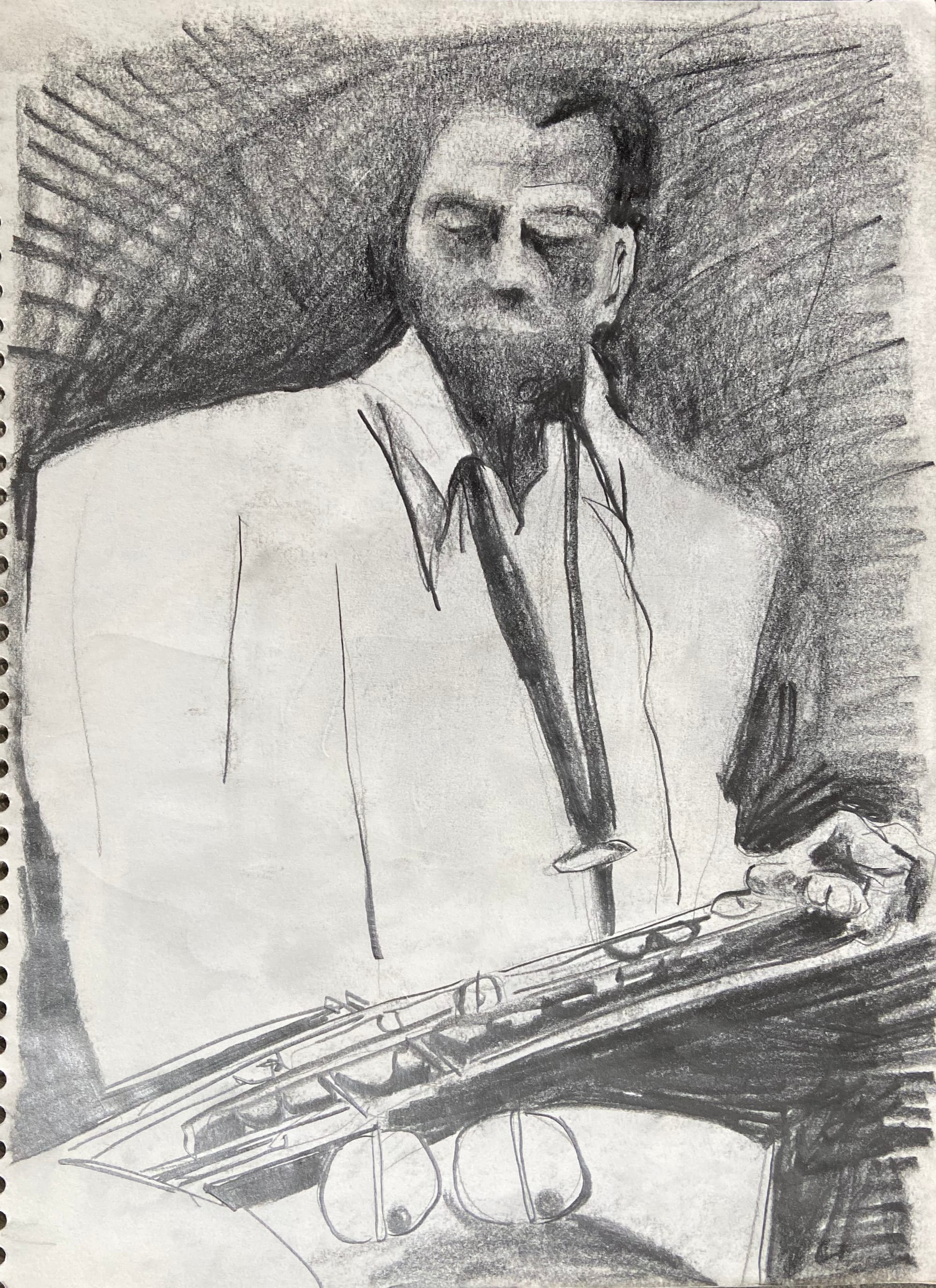 Early 90s(?) Not sure where I did this but I know it was based on a photograph of a musician. 4b graphite pencil, the big flat kind. I can tell it's a 4b from the density of the dark areas, and the flat lead by the variation of the line.