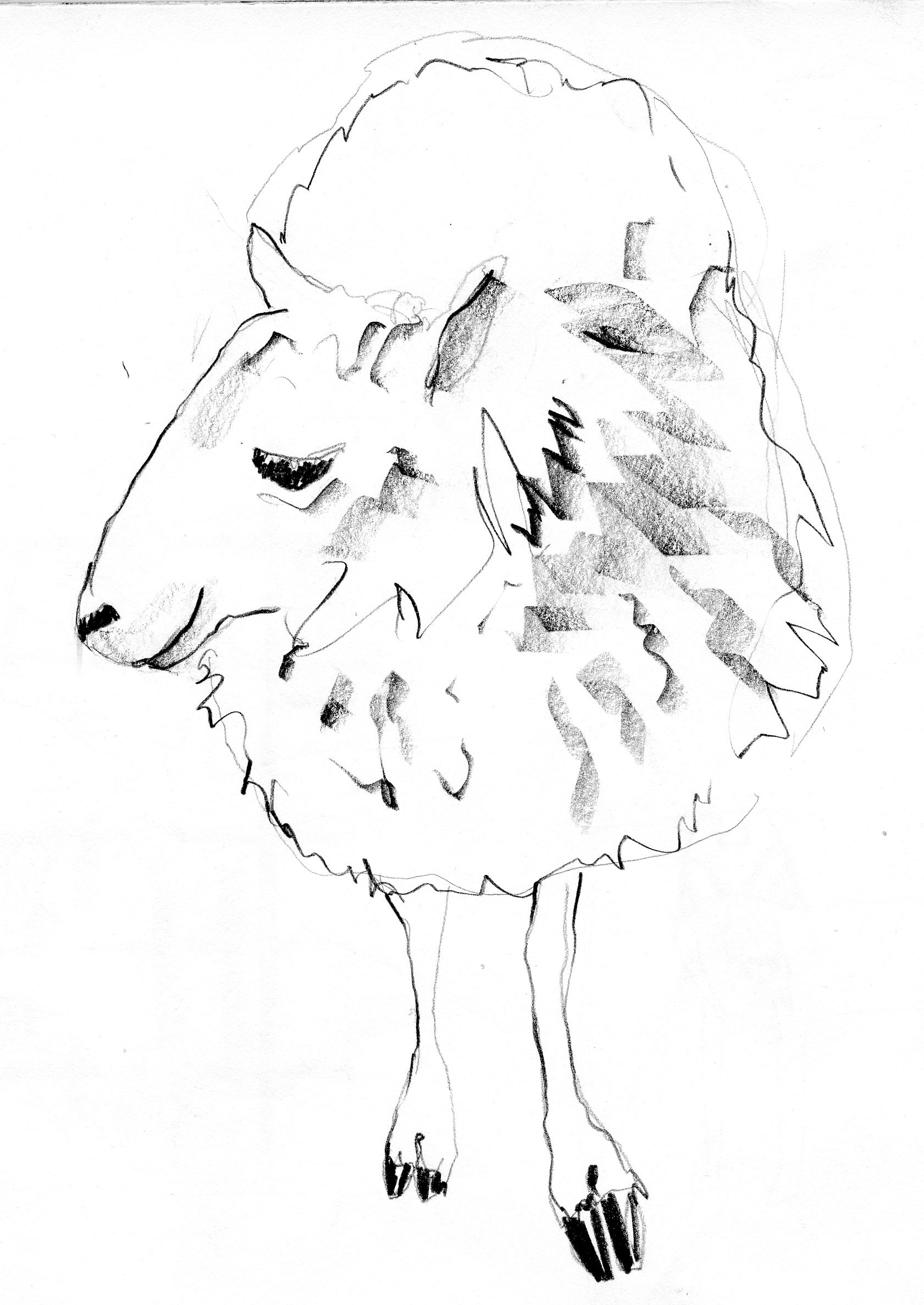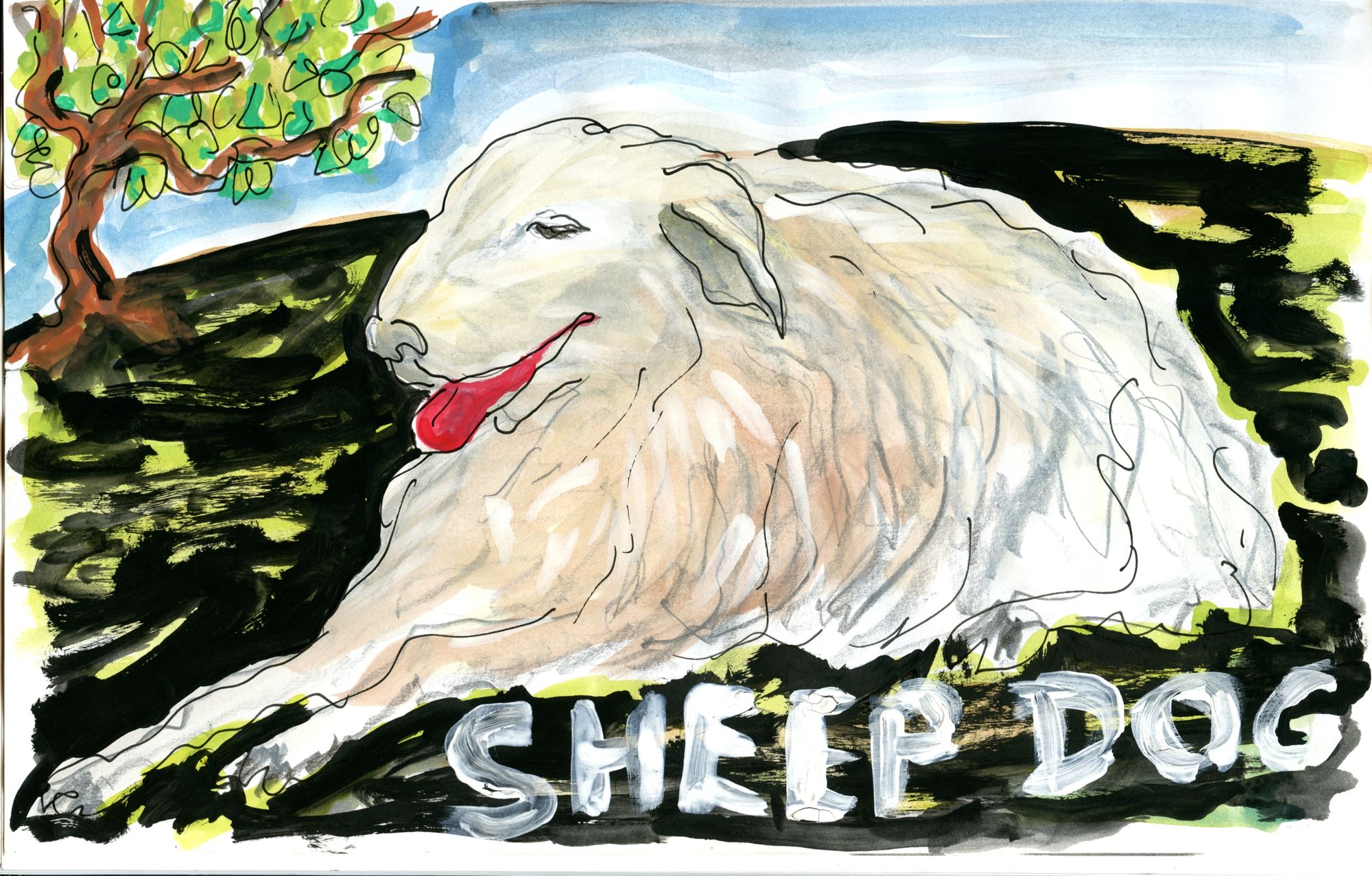 Another failed drawing that turned into something else. One of my Faithful Readers sent me a photo she took of a sheep. I simply could not make a drawing I liked from that photo – the sheep kept coming out looking like a retriever – so I figured just make it a 'sheep dog'.