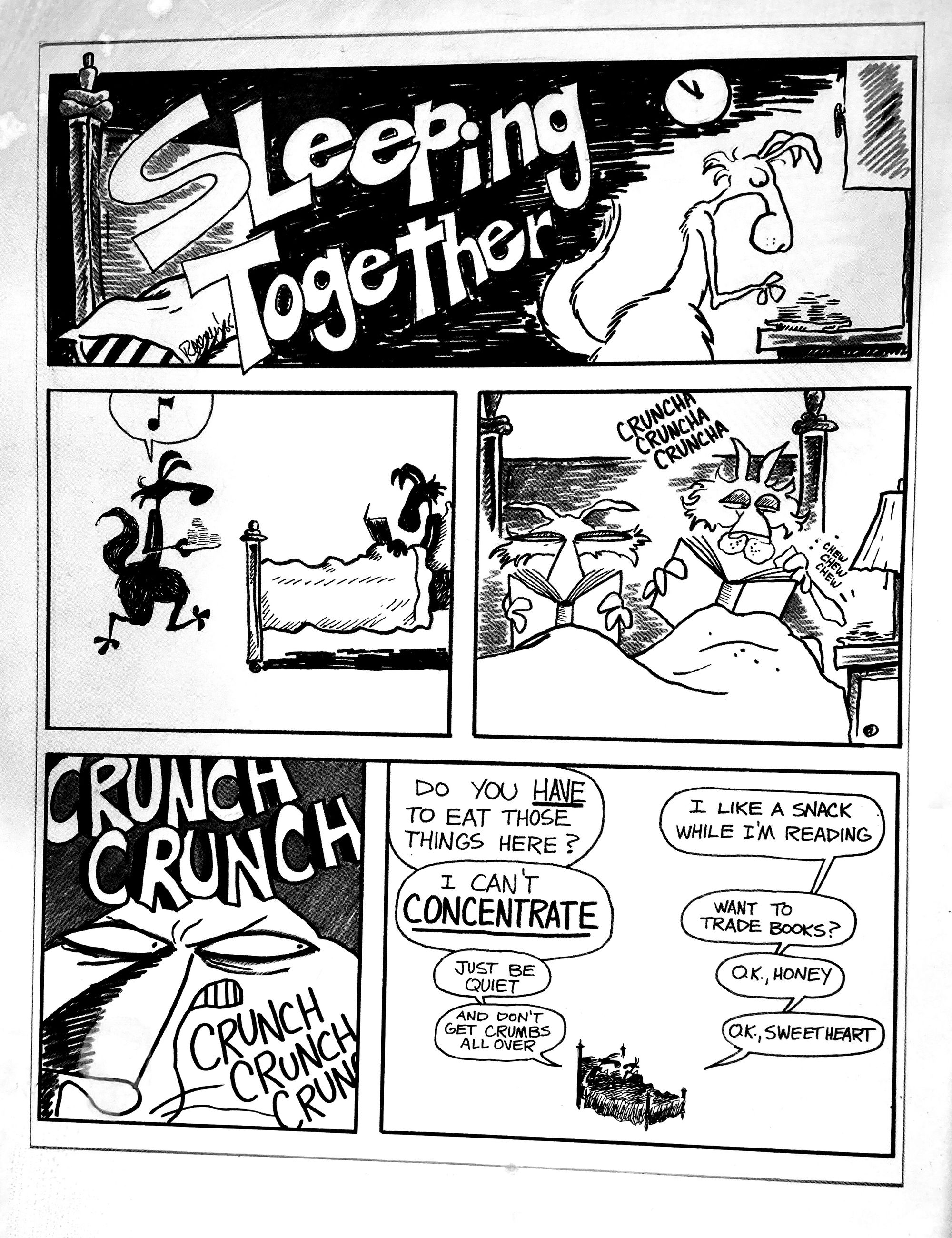 Who hasn't slept next to a noisy partner? This was the first panel of two that were in a show of my work in a bookstore on South Granville, circa 1985. This is a copy of the original because somebody bought both pieces. I can't remember what I charged.