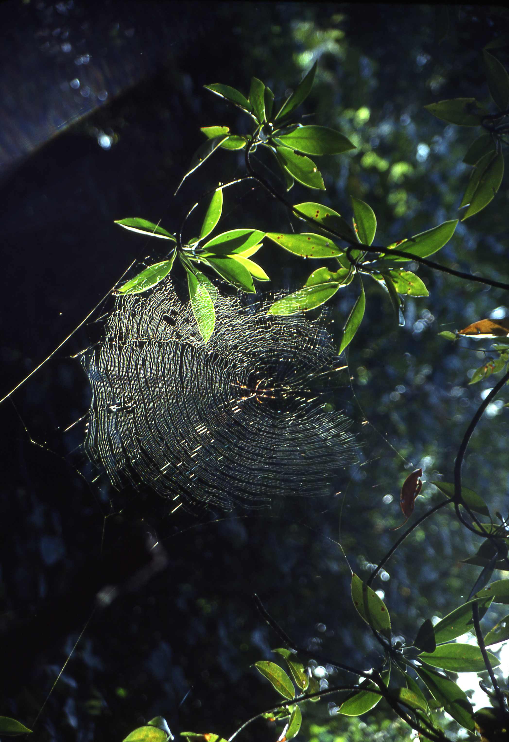 1994 Fiji. I don't usually take pictures of scenery but this magnificent spider web caught my eye while I was out walking in the woods. It was easily almost two feet in diameter, but the light was fleeting and I was not carrying my camera so the shot was lost. Next day I went back at the same time with my camera and was delighted to see the spider web still intact, with the same beautiful light shining on it.