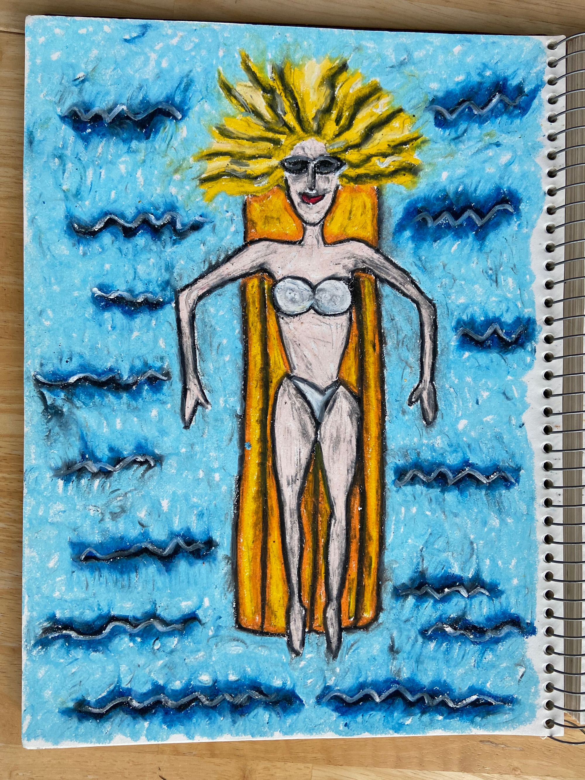 This was done in oil pastel, or, as I like to call them "Adult Crayons". Although they're not suited to any kind of detail, they're fun to use. I call this my brief David Hockney period.