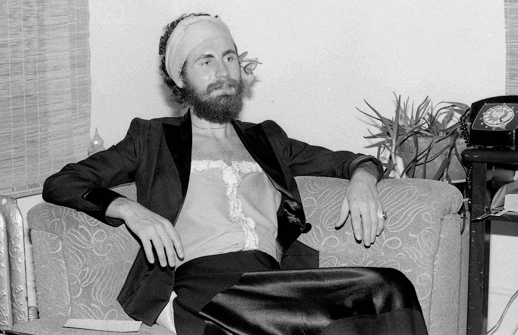 There's just something extra fun about a man in drag who has a beard. Catch the rotary phone and radiator at the sides of the photo!