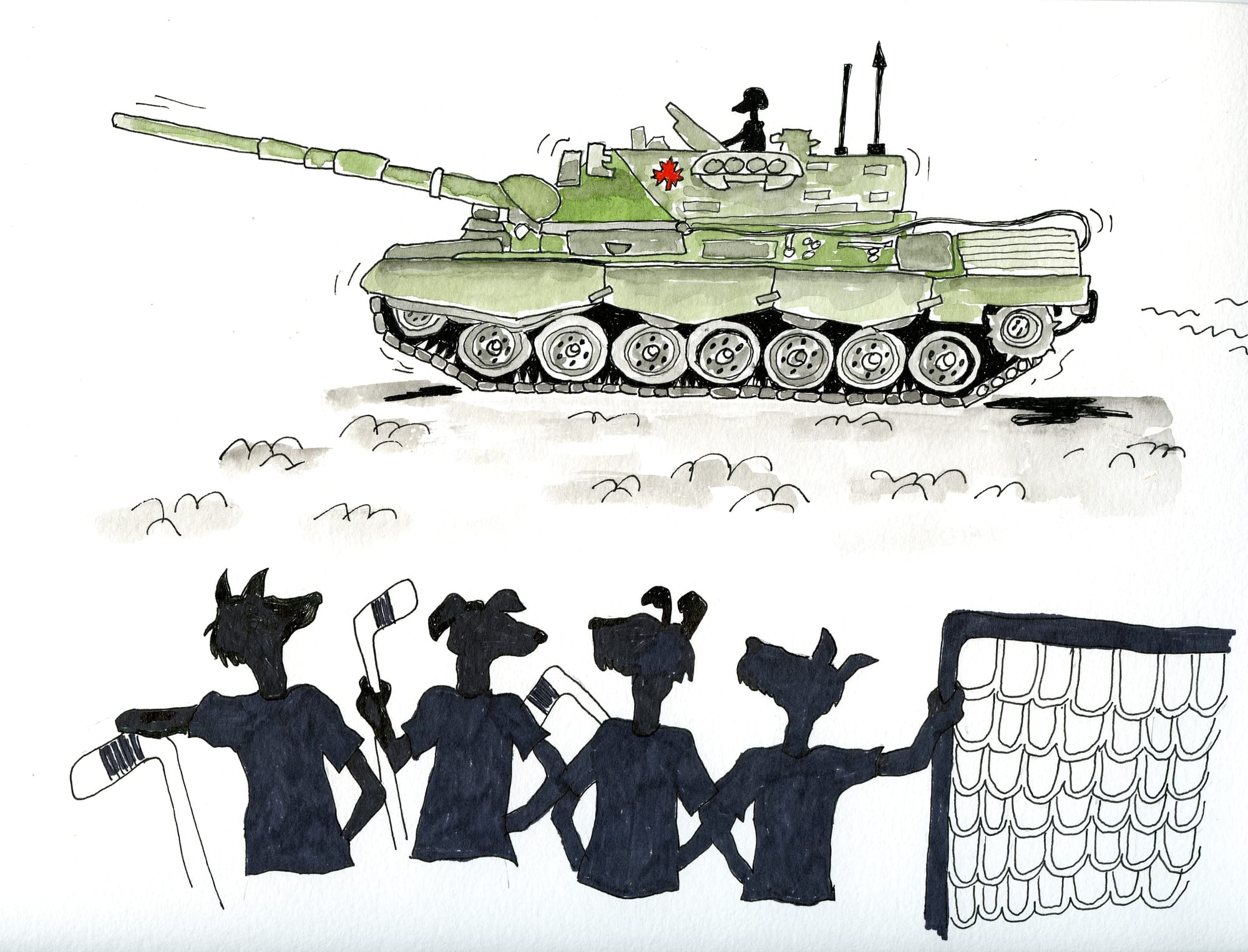 "We had decided to do something uniquely Canadian for our confused but intrigued multi-national spectators. We were going to play ball hockey! Sticks, balls, and even a couple of goalie nets somehow made their way to Camp Butmir, Sarajevo in time for Canada Day and the return to our collective childhoods. We played on with such glee and conviction until, spontaneously and unscripted, someone yelled out, "CAR!" Although no car was seen, we all dutifully trotted off the road. The goalies shouldered their nets and followed suit. A few moments passed as we waited for the imaginary car to pass. Then again that voice: "GAME ON!" and we all trotted back. The goalies set their nets as quickly as they could and the game feverishly resumed on cue. Then we all collapsed in laughter. Our audience however, was even more confused than ever, so that crazy Canuck reputation was firmly intact."
