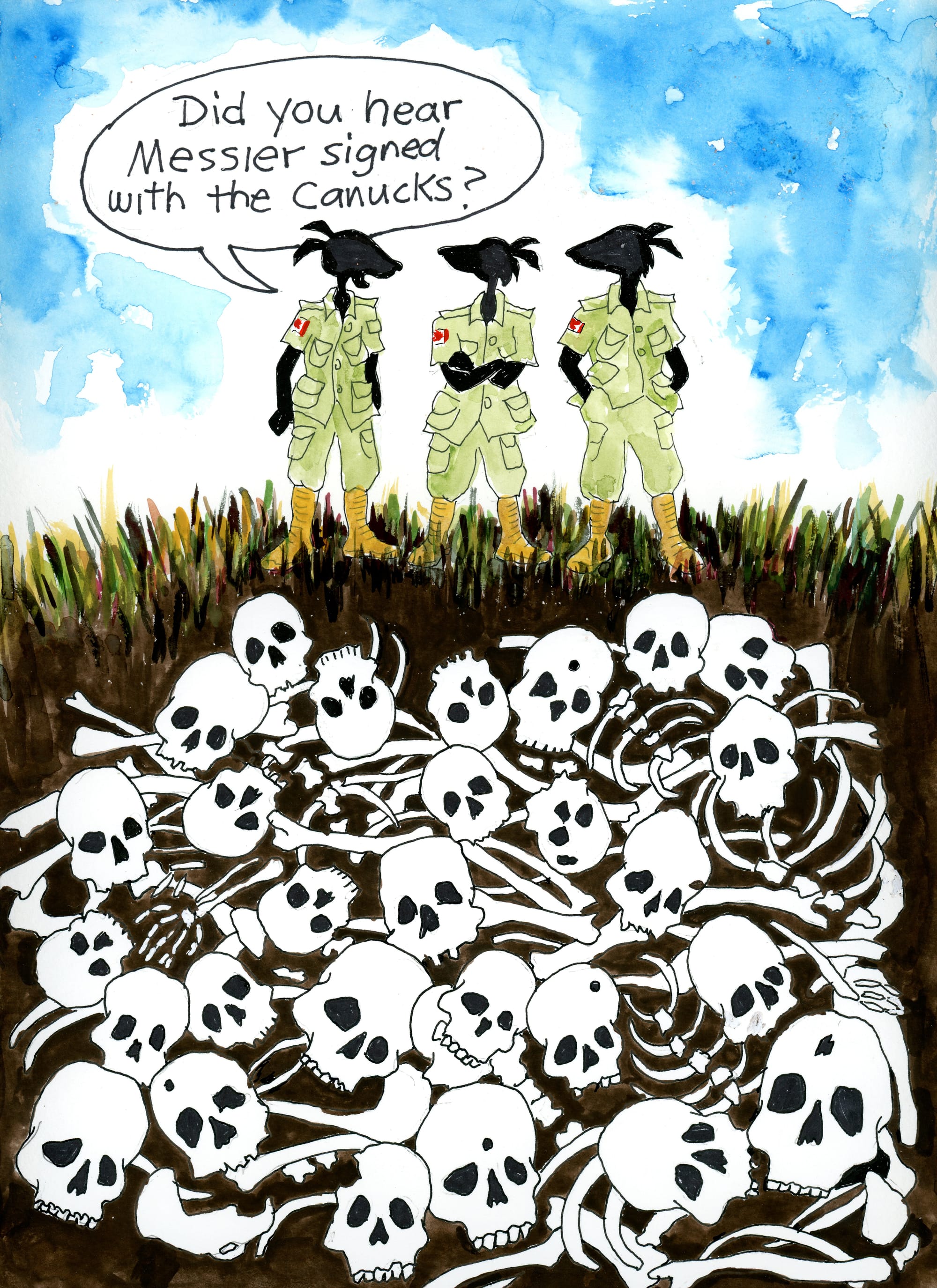 A young guy working away recognized my uniform and introduced himself. He said he was from Burnaby and was a grad student studying Forensic Anthropology at the U of S in Saskatoon. Small world. I asked about some long threads I noticed along the leg bones. He explained that despite it being a hot day, the executed had been wearing multiple layers of clothing. They had no other way to carry their belongings. Five years later, nylon threads were all that remained. It felt awkward and uncomfortable to learn that. I asked if he was a Canucks fan. He said he was. Had he heard we got Marc Messier? Yes, he said a bit excitedly. It was like we both wanted to escape for a moment. Talk about anything else to get through this.