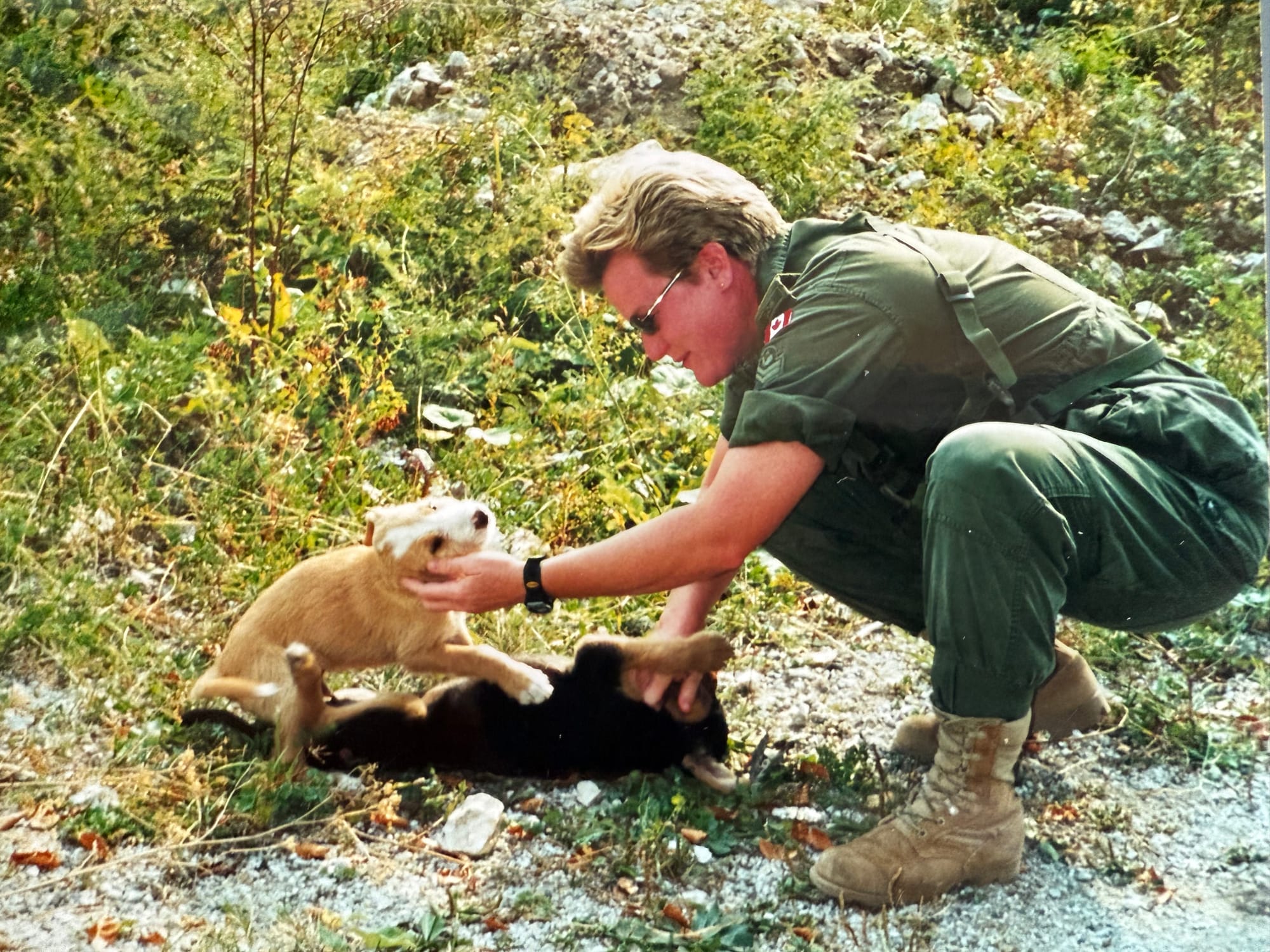 On one such occasion I drove a few of my friends, including Master Warrant Officer Don Jessome (who was also our contingent Sergeant Major) up into the hills above Sarajevo. We stopped a few times to see the positions where the Serbs had lobbed daily mortar rounds into the vulnerable city below for over three years during the war. But this time I stopped because I saw some sweet puppy faces off in the long grass on the side of the road. With all that had happened to this beleaguered city, getting pets spayed and neutered hadn't yet reached the top of the recovery list. Many times before I'd seen these little faces and couldn't stop but this time I could. And so I did. The others didn't understand at first until I was road side with them. I crouched down, talking to them gently as I did my own dog Tilly who I missed so much. Sure enough, out they tumbled and we all had play cuddles and giggles for a few cherished moments. So good for everyone's soul and it was hard to let the puppies wander off again.