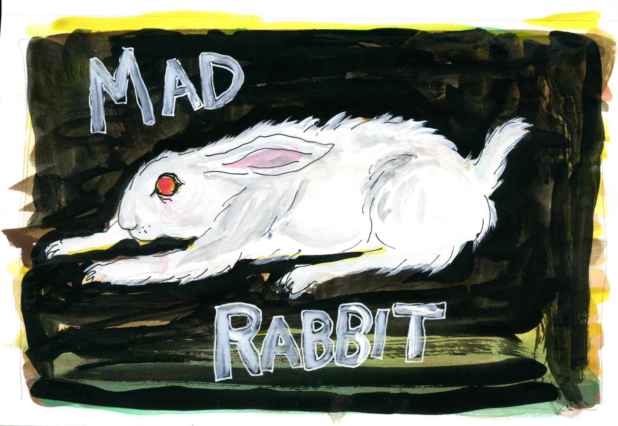 This is what happens when you set out to do an Albrecht Durer type drawing of a rabbit, become bored, mess it up, then decide 'What the hell, I haven't opened these tubes of goache yet'.