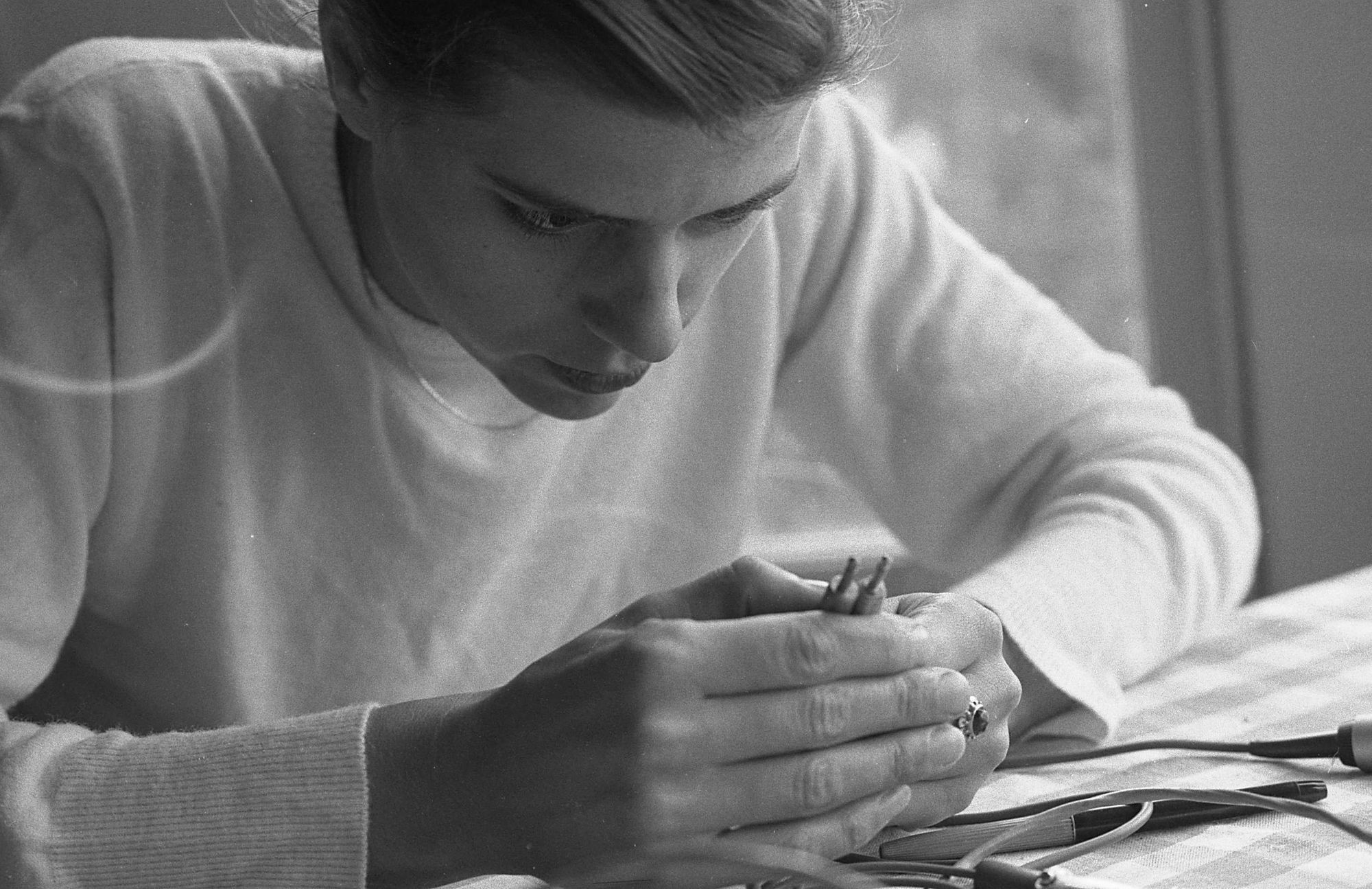 Liz, trying to figure out which plug went where in the recording device.