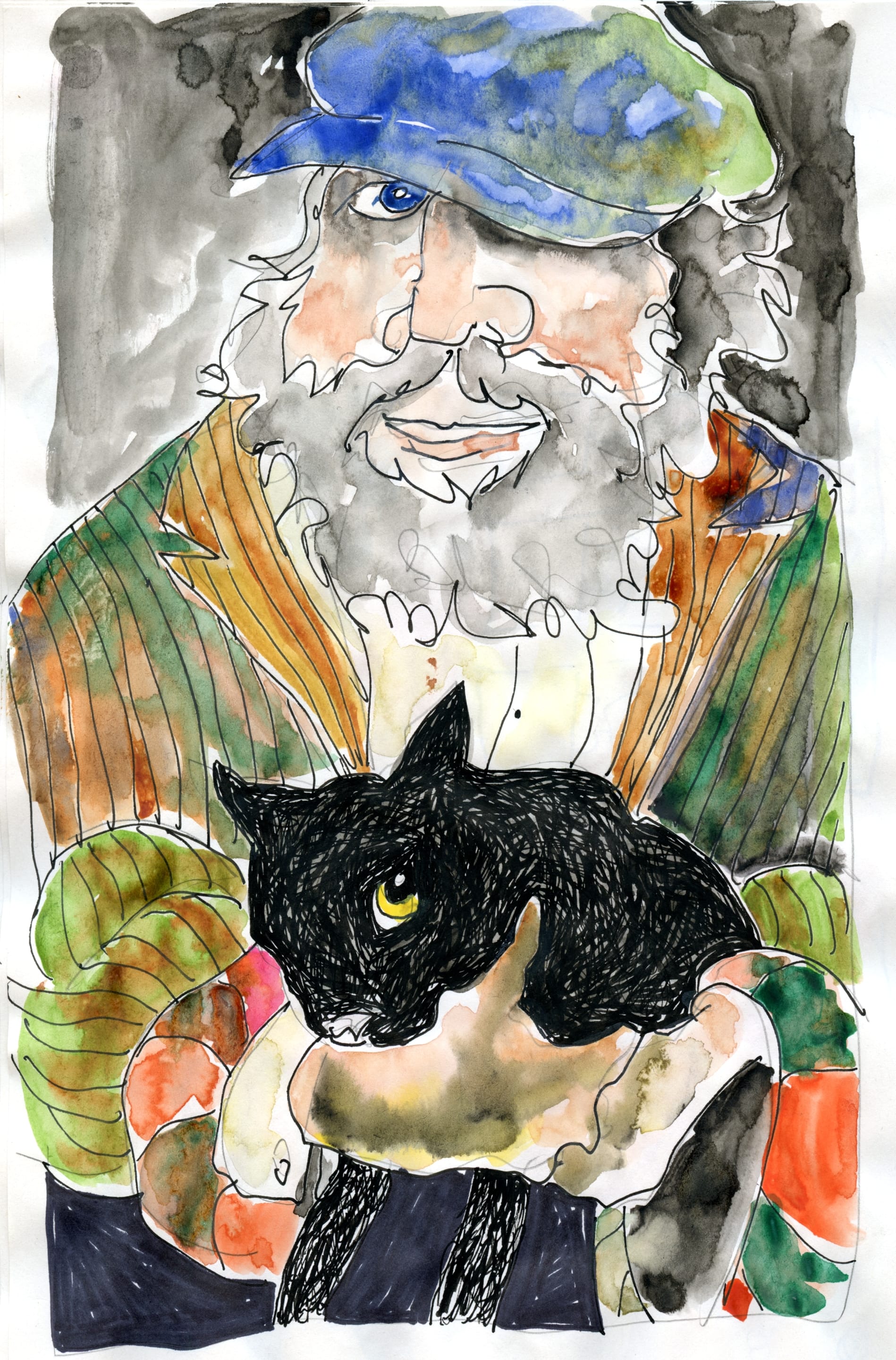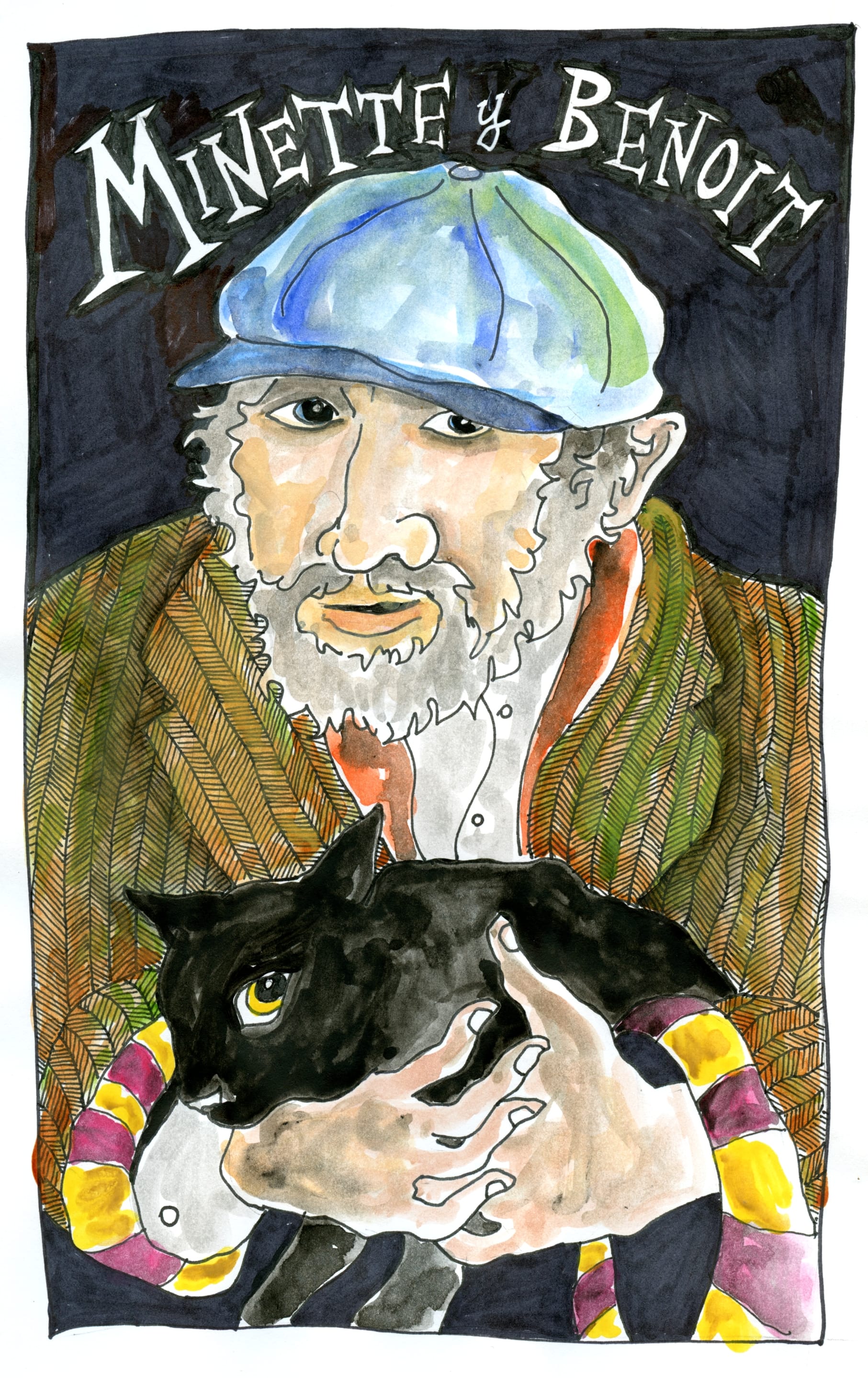 This was based on a portrait from my favourite Brassai book of photographs, 'The Secret Paris of the 30s' from which I've done a number of pieces. Benoit was a homeless man who lived next to the Seine, under the arches of the Pont Neuf. Benoit, as Brassai came to know him, lived with his girlfriend Doudou and their cat Minette. Doudou was too suspicious of strangers – street people in Paris at that time were routinely run off or harrased by the police – to let herself be photographed but Minette the cat was friendly.