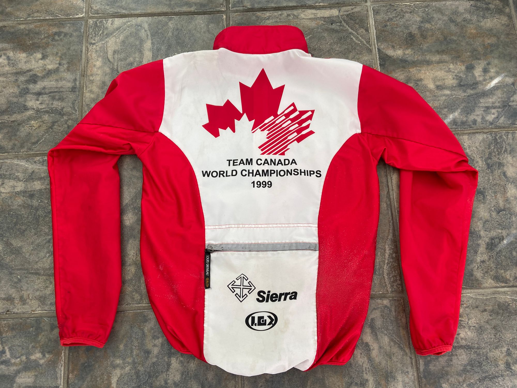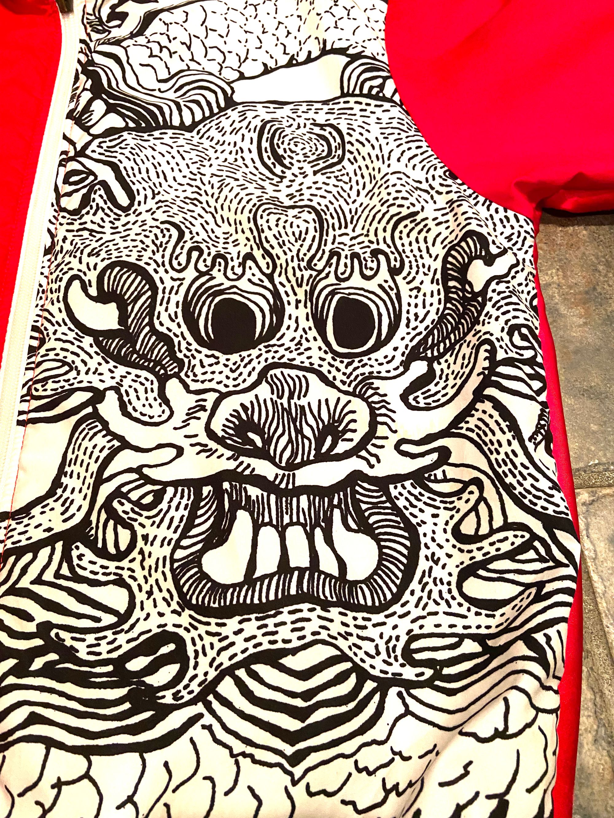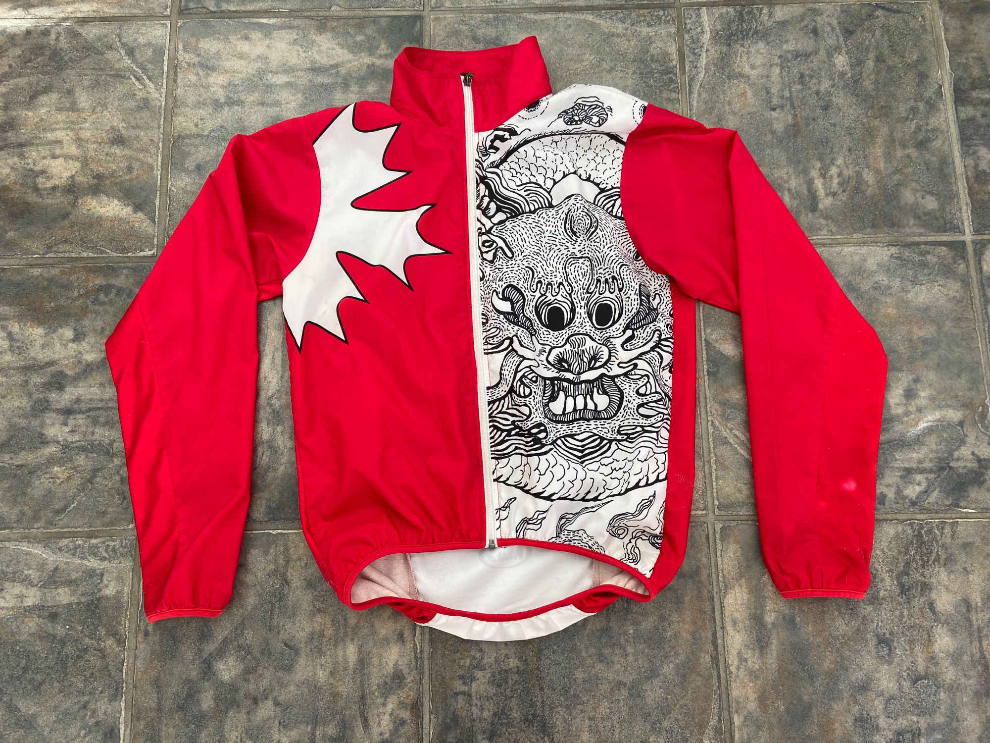 This was the warmup jacket design I did for the False Creek Women's Dragon Boat team in 1999 when they went to the world championships in London. I got the idea for the dragon on the front from a Chinese tapestry that was in a museum. I did a line drawing that was blown up to fit on the left front panel, with a partial maple leaf on the right side. I just did the text on the back of the jacket – someone else had done the maple leaf/paddle logo years before (it was one of the club logos). Sugoi in Vancouver made these garments. They were actually cycling jackets but they worked well for the paddlers.