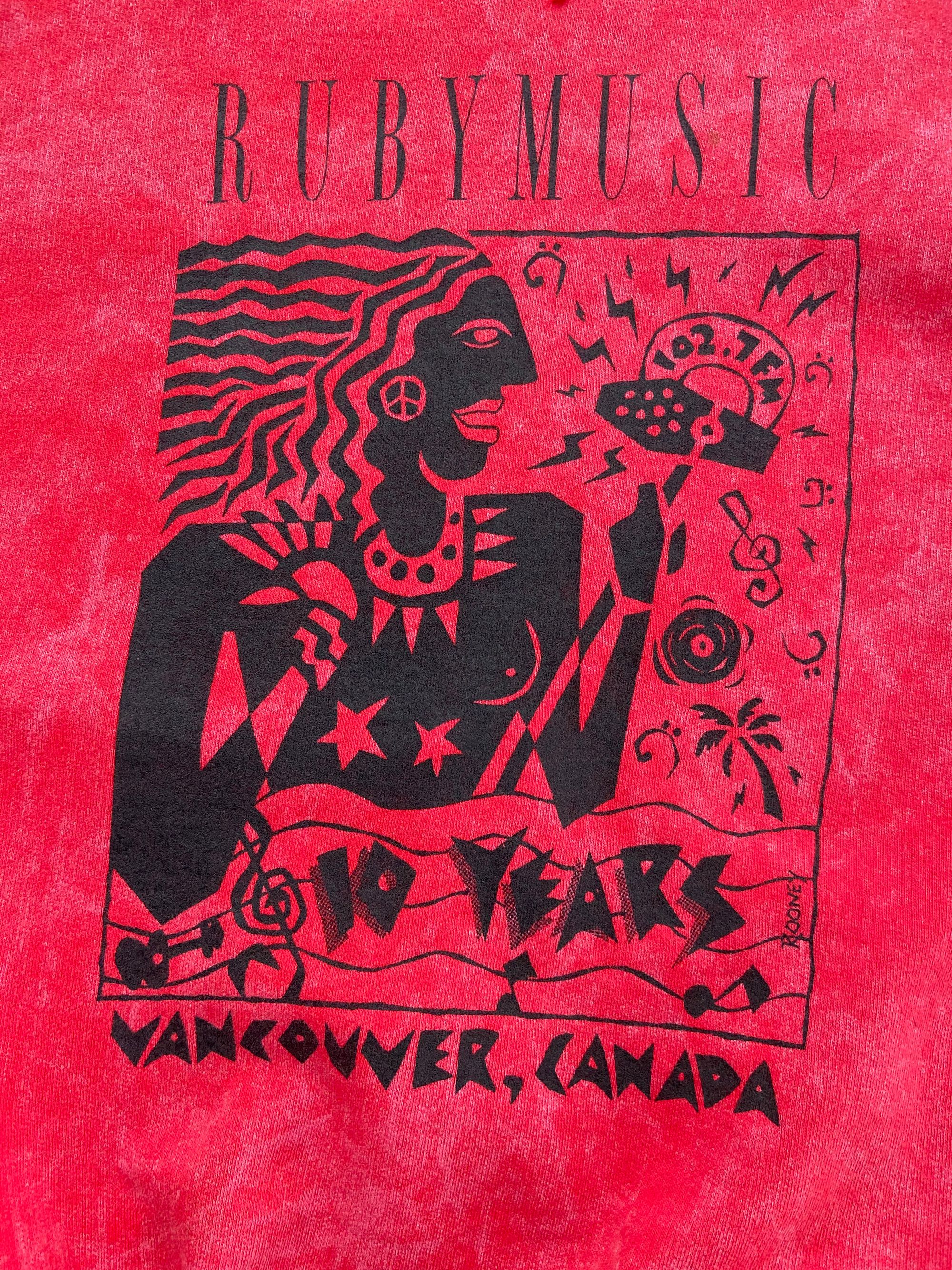 This was done to commemorate the 10th anniversay of Co-op Radio's RubyMusic program. The original artwork was done on repro paper (my printer friends will remember what that was – do they even make it any more?) Repro was a gorgeous type of paper, originally made for use in letterpress galleys. It was a heavy paper with a brilliant white clay coating. Inked type, when pressed against this, produced a super sharp text, with zero bleed. It was a dream to draw on with a technical or felt pen, and would accept letraset beautifully, too. If doing pen-ruling, you could actually scratch the coating off (using a printer's magnifying glass) to make a precise 90 degree edge. OK, I know, too much detail.