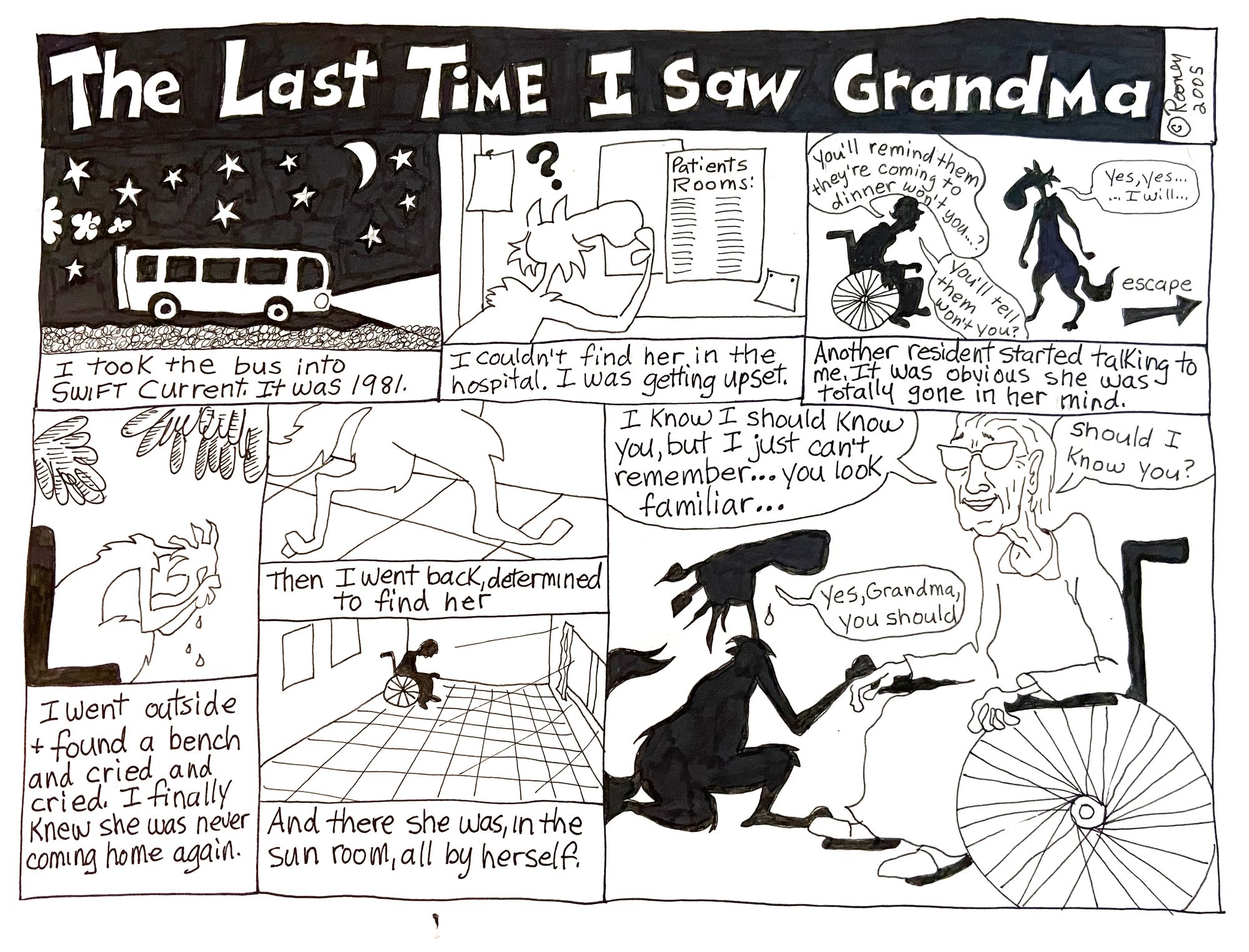 I started drawing stories (as an adult) in 2005. This one was about visiting Grandma after she went into a care home in Swift Current. At age 94, her fine mind and memory had finally failed her – she didn't really know who I was – but she still retained her wry wit and was aware of where she was. Where she was was the top floor of Palliser hospital, the floor where the no-hopers were put. She didn't seem angry about anything, she just accepted her lot at the hospital without complaining.