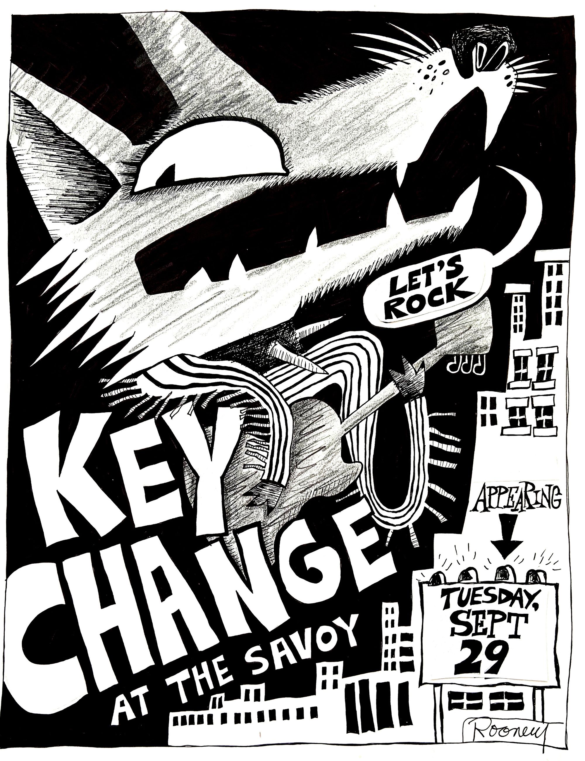 Years ago an acquaintance of mine played bass in a women's band called Key Change. They got a gig at the Savoy and needed a flier to promote things so this is what I came up with. I was big on animal imagery at the time, hence the dog. Or maybe the acquaintance had a dog. Anyway, they liked it – hey, it was free – and tacked a bunch up around the neighbourhood. I don't know how the gig went because for some reason I couldn't attend.