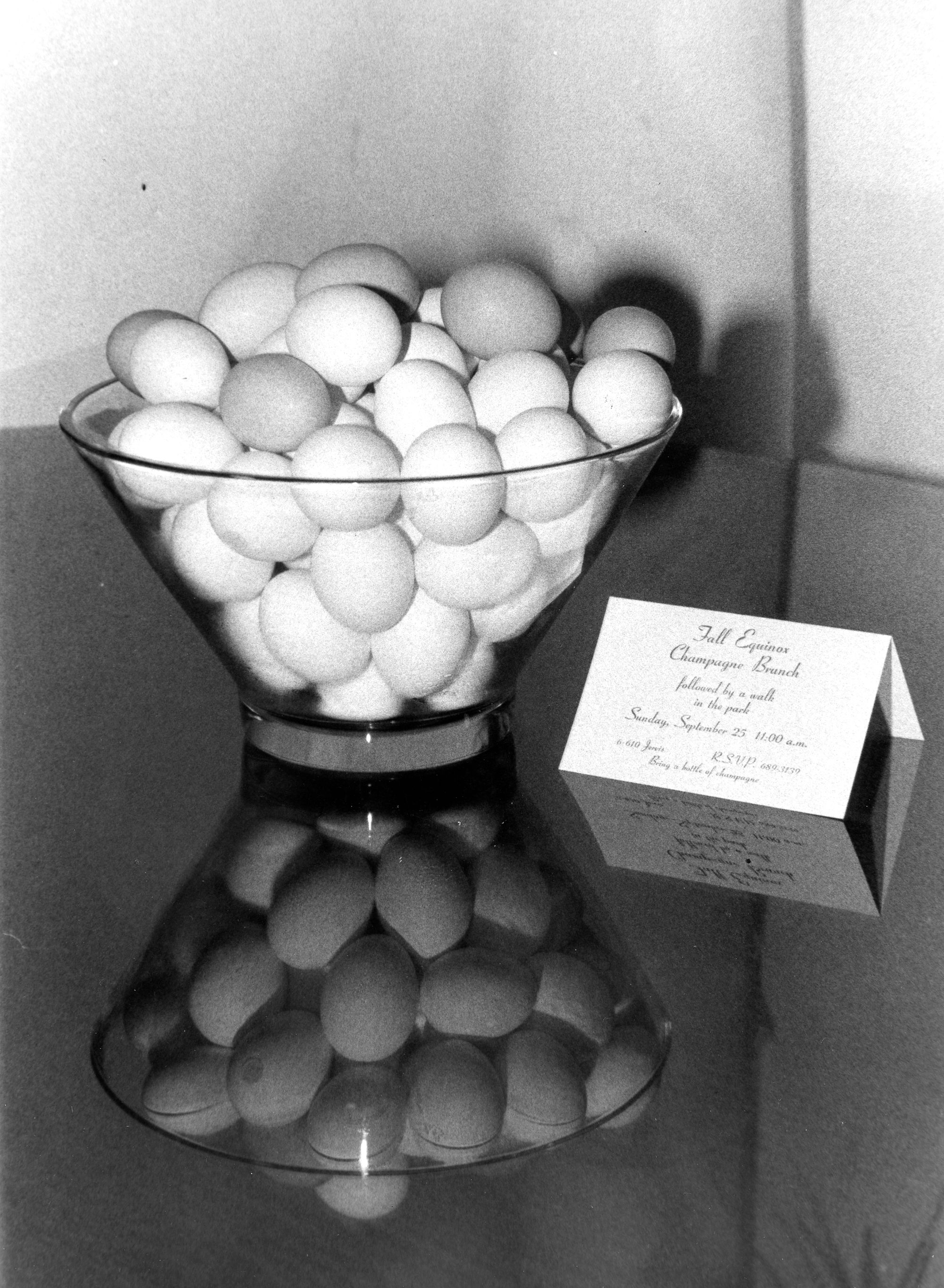 Eggs and invitation to a Fall Equinox brunch at #110 in the Banffshire (Stephen and Gary's apartment). A swarm of friends came and since they only had two frying pans, they must have been making omelettes for an hour. I've always liked how the glass topped table reflected anything that was put on it. Whatever happened to that beautiful glass bowl?