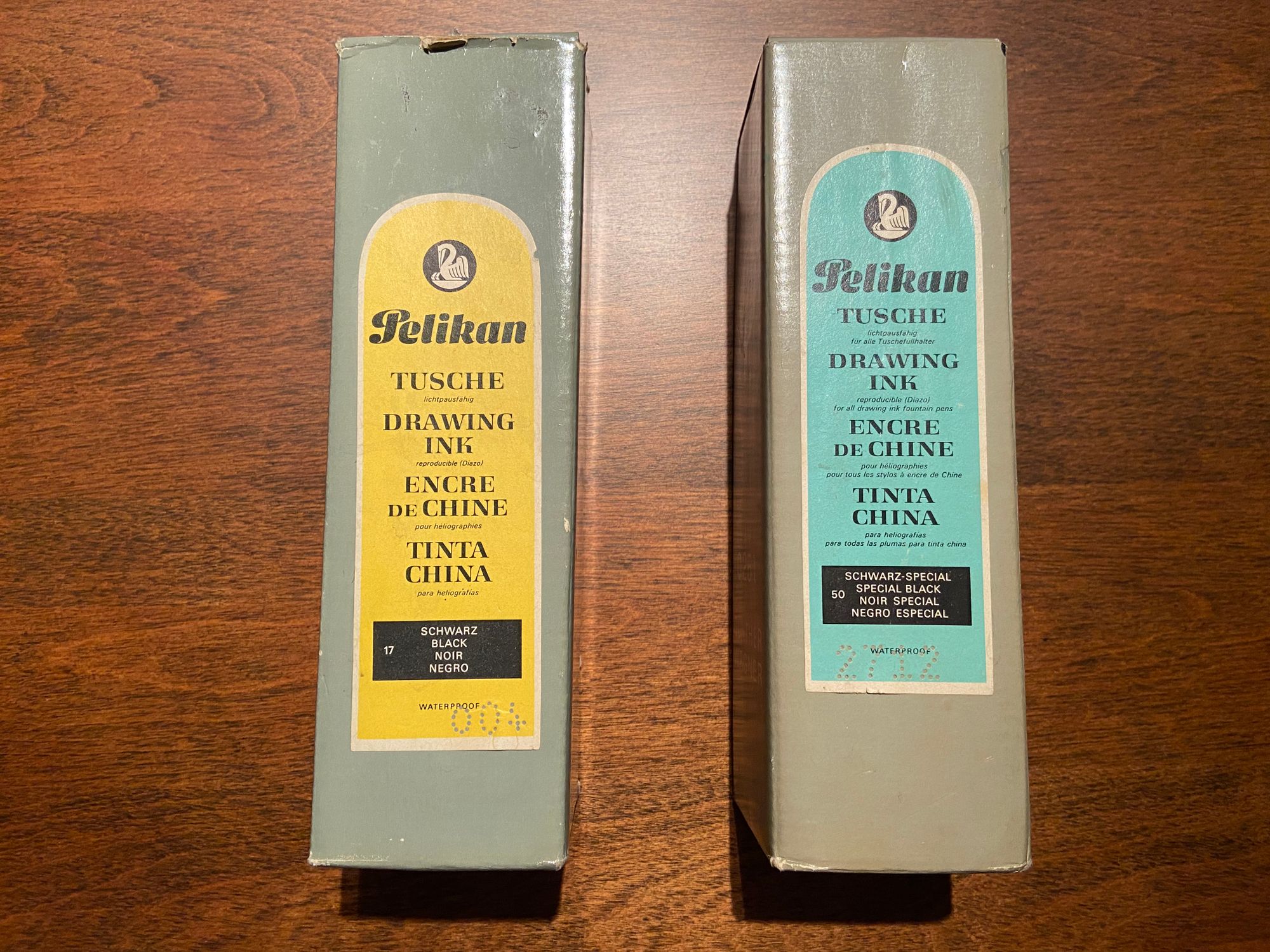 #17 and #50 Both of these are black ink, but the yellow label is not as dense as the blue label. Both are very old bottles, circa the 80s, saved, husbanded and doled out – literally from an eyedropper -- to my precious technical pens.