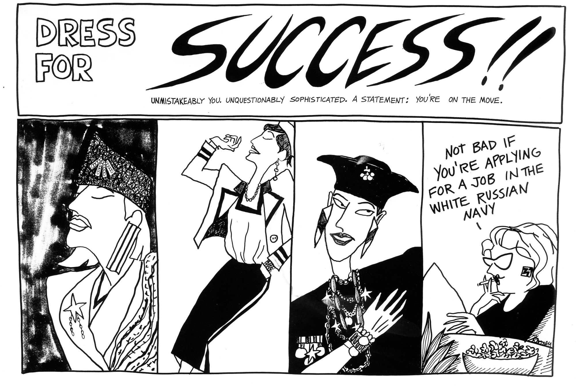 This would have gone into the Connie series. The three model panels were drawn from actual fashion magazines. The headline text is actual ad-speak.