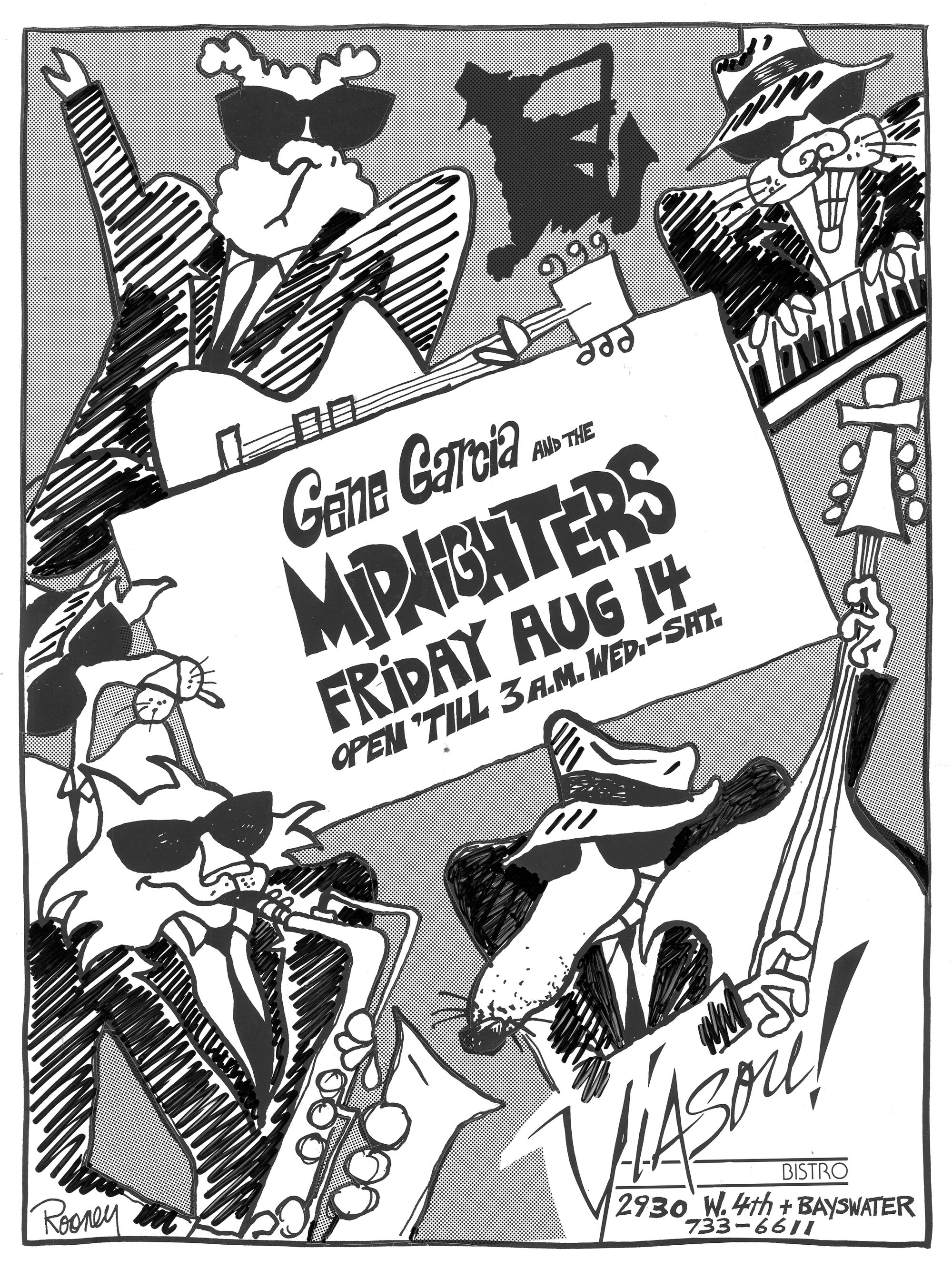 Yiasou Greek Restaurant (yes, the same one that ripped me off) used to have entertainment on weekends. The Midnighters were one of the acts; I did this flier before I dumped them as a client.