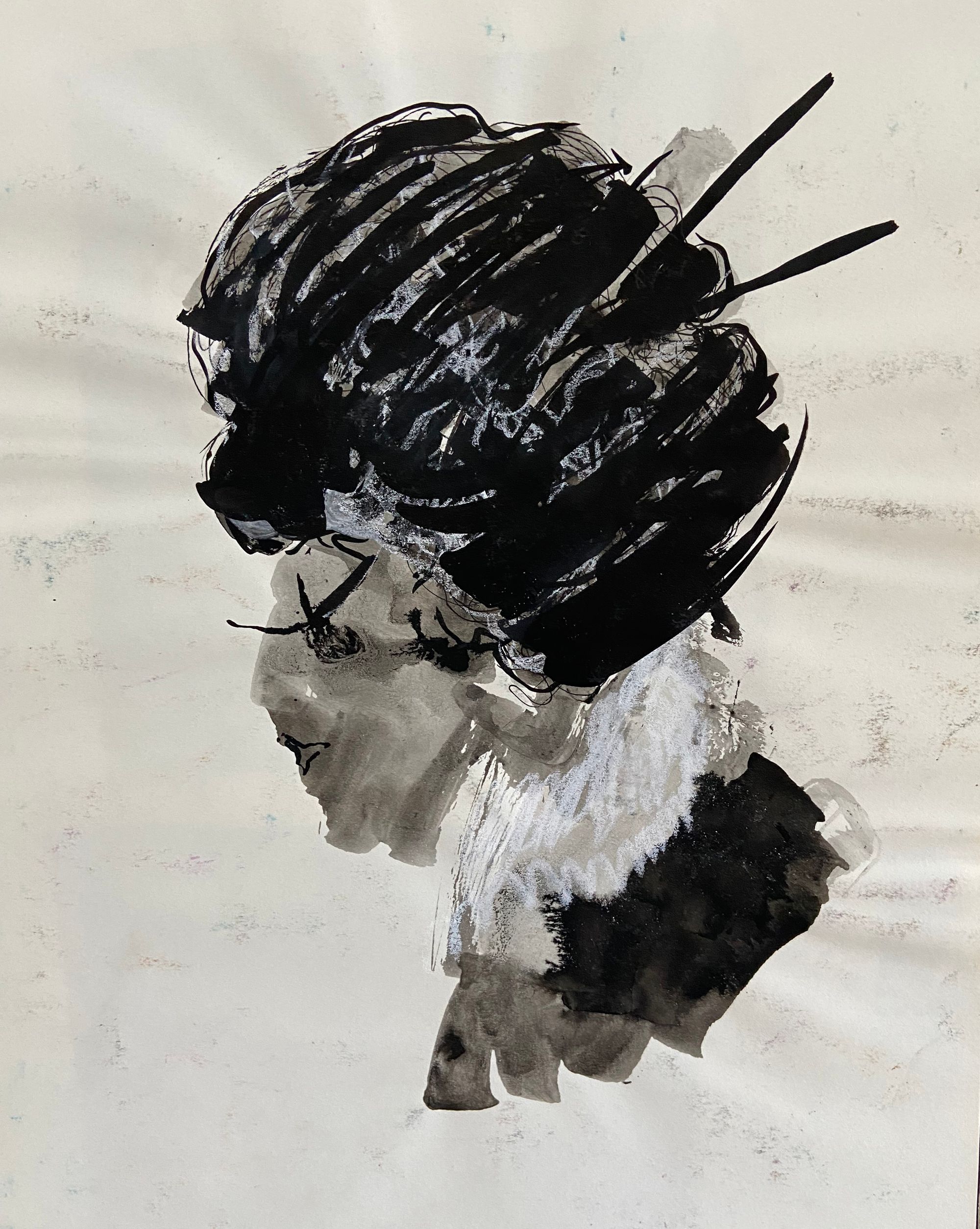 I was cleaning my brush one day – random swatches to get rid of the excess ink, then rinse and repeat – when I suddenly realized it looked like a lady's head from the side. I added a few lines, some white paint and suddenly had an abstract portrait.