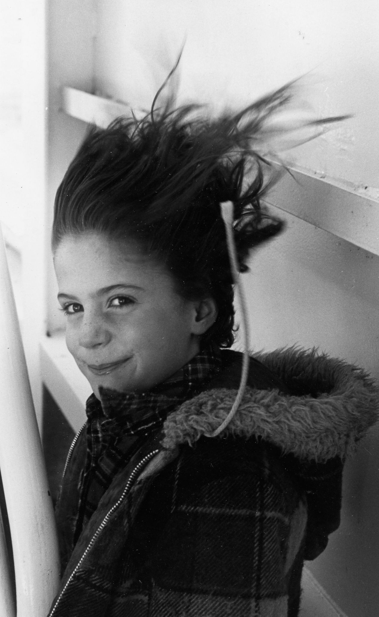 This little girl was playing on the upper deck of the ferry during one of my many trips to visit Victoria back in the 70s. There was a strong updraft in the stairwell where I took this photo. She loved posing!