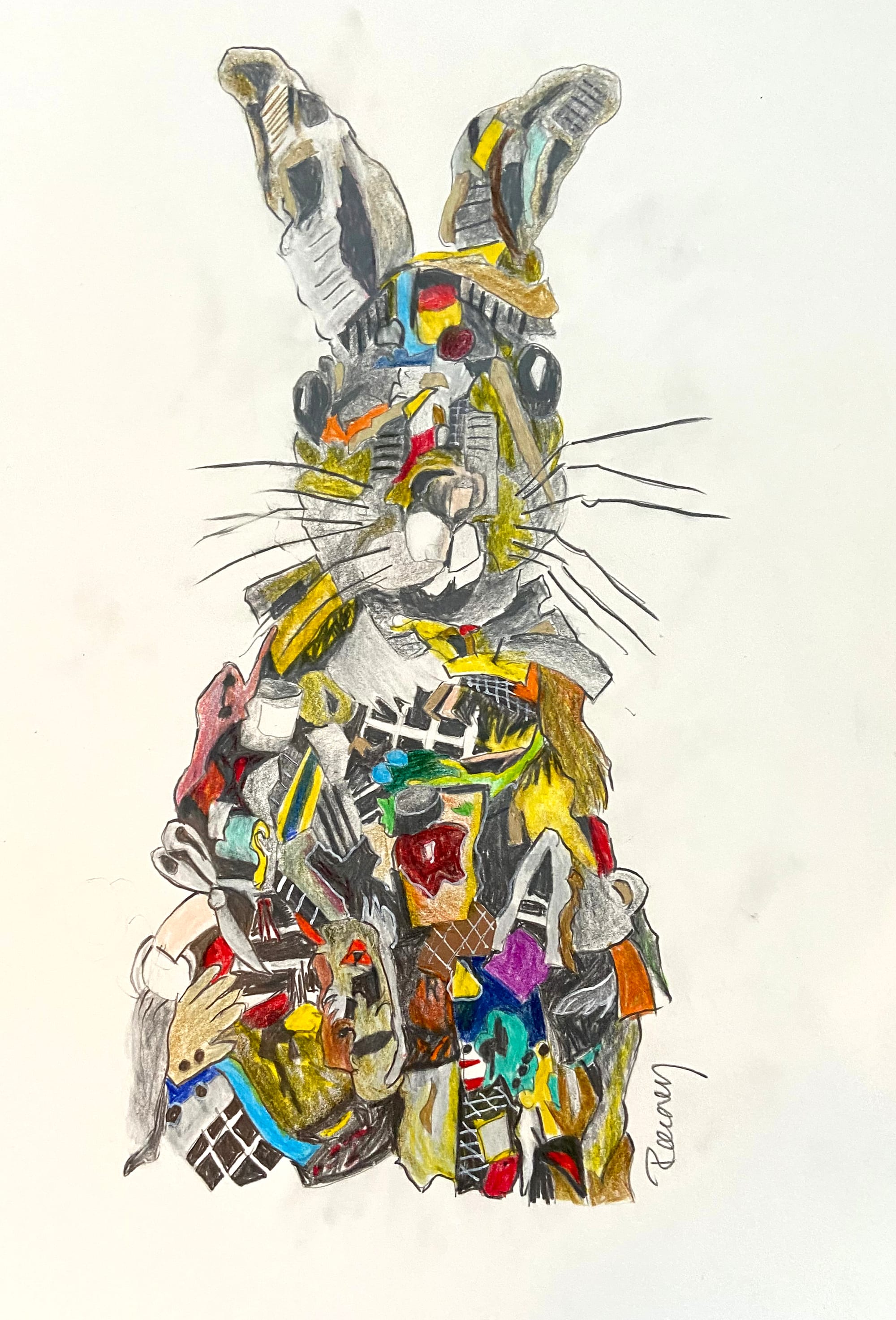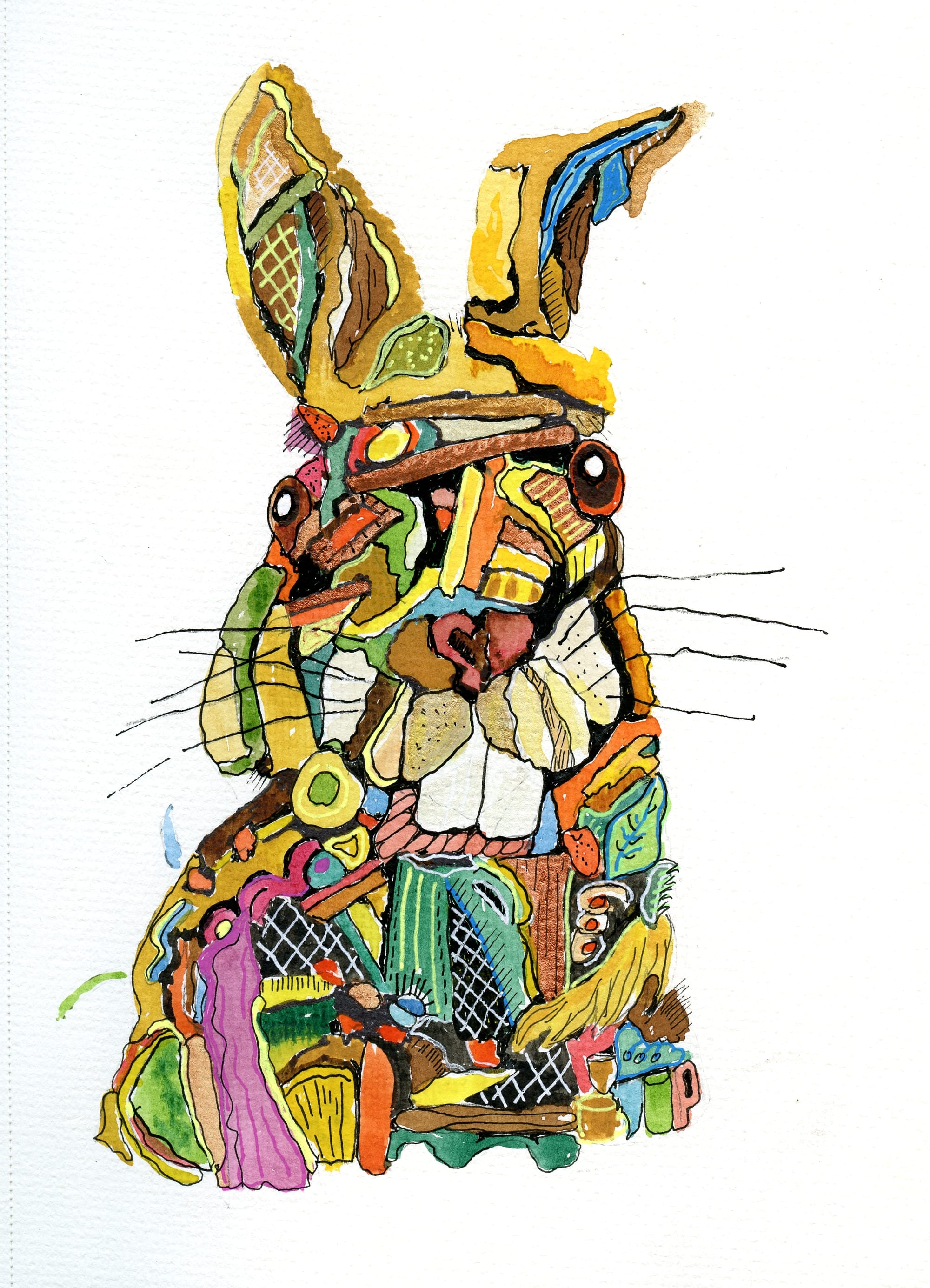 These were based on a photo one of my Faithful Readers took in Porto, Portugal. The city had a wonderful array of street art, the best of which was a spectacular two story 'rabbit' made entirely from trash, on the outside of a building. I wanted to paint my own 'trash rabbit' from this, which turned out to be much harder than anticipated. I made four attempts but trying to duplicate the original in all its intricate detail was beyond my skills. Maybe "Expressionist Trash Rabbit" might be a better title. As often happens, the first one done (#2 here) is my favorite.