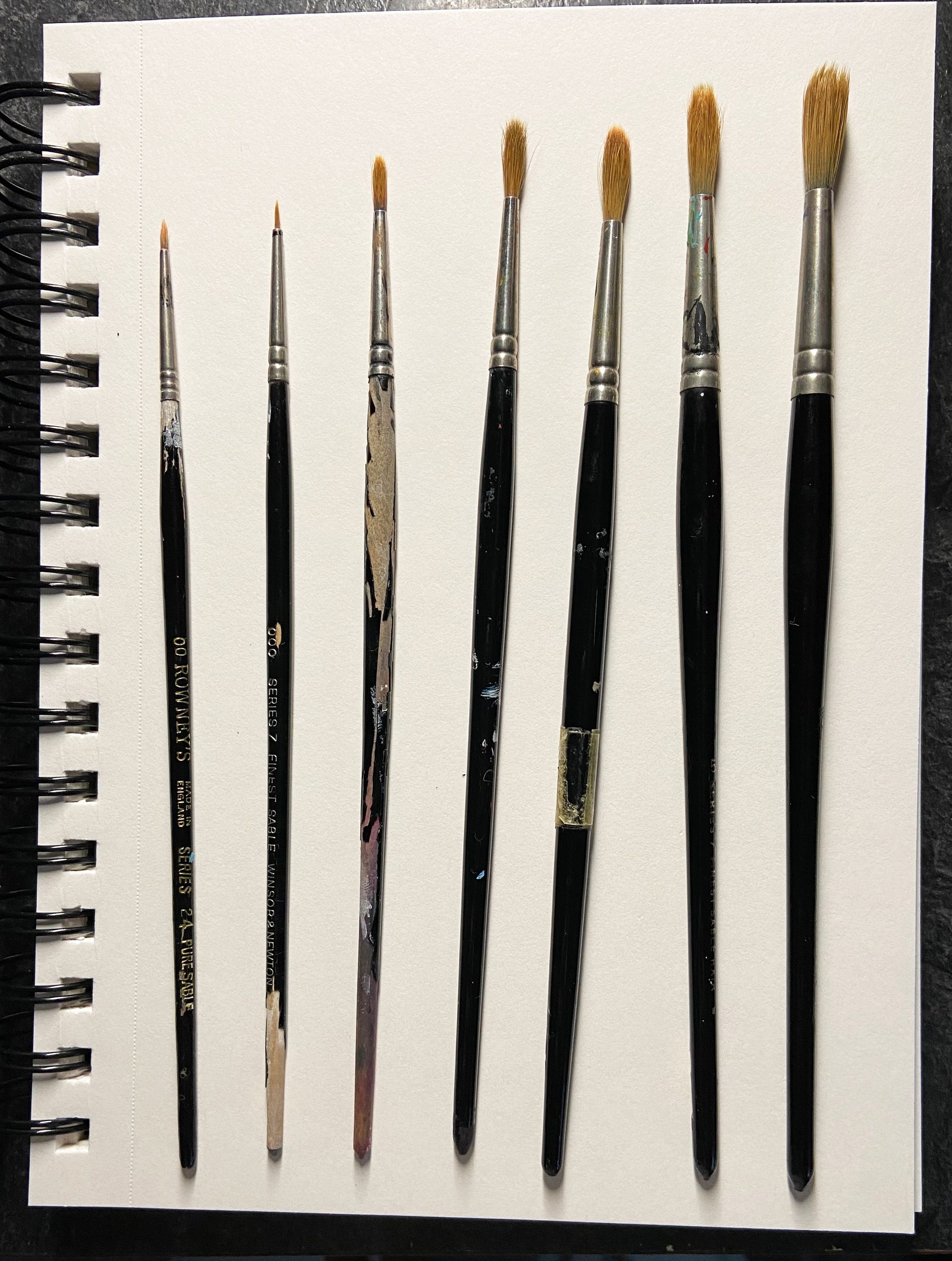 They were outrageously expensive at the time (and still are) but we had carte blanche to order all we wanted because if a department didn't spend its entire budget in a year, it would be cut back the next. Obscene waste from which we – myself and the illustrative artist – benefitted. I'm embarrassed to confess how badly I treated those brushes – left standing in water, used with acrylic paint (SHAME!!) and often not cleaned properly. I still have a lot of them, some sad and stiff from abuse but a few still very useable. I treat them like gold. (For gold they almost are, the incomplete set below would cost over $500.00 to replace today).
